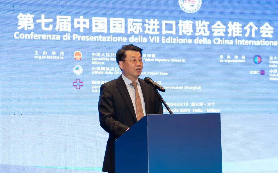4月19日,中国驻米兰总领事刘侃出席第七届进博会意大利推介会并致辞,会议由负责经济商务事务的参赞耿协威主持。中国国际进口博览局副局长孙成海,伦巴第大区秘书长卡塔内奥,意大利中国商会秘书长范显伟,中国工商银行总行国际业务部副总经理张悦,意大利中国理事基金会秘书长贝廷等嘉宾出席并致辞,中意各界人士约150人参加。