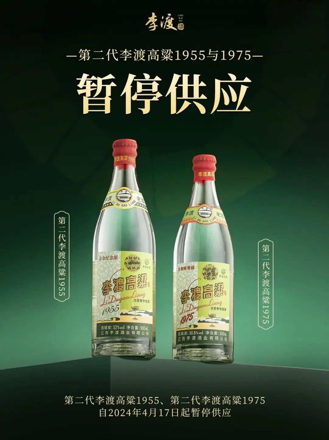 4月18日,李渡酒业发布通知称,第二代李渡高粱1955、1975产品自升级上市以来,深受广大国粉的喜爱,因老酒资源稀缺,公司决定自2024年4月17日起暂停供应,如恢复供应另行通知。