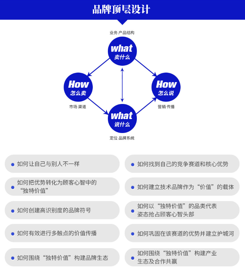 通过卖什么,明确企业卖什么产品和产品结构的问题;通过说什么,解决企业对外品牌形象建立的问题;通过怎么说,解决企业对外传播点和传播方式的问题;通过怎么卖,解决企业的渠道和市场扩张的问题。