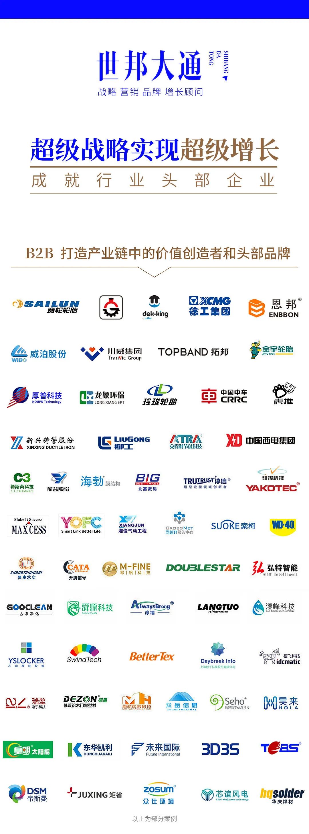 世邦大通咨询始终围绕解决B2B企业品牌价值塑造及营收增长的核心问题,深耕策划行业20余年,专家团队为国家名片提名人和终审评委、国家工信部专精特新评审专家、上海市政府品牌专家委员单位,助力企业成就细分行业龙头品牌,专注为B2B企业提供品牌建设及营销驱动增长,以“所有的事都是一件事,分开了就不成立”为理念,先后服务近百个一线企业、200多个专精特新企业、200多家的工业企业,覆盖了初创型企业到行业头部不同阶段类型,为企业制定品牌增长战略,并用创意引爆战略。