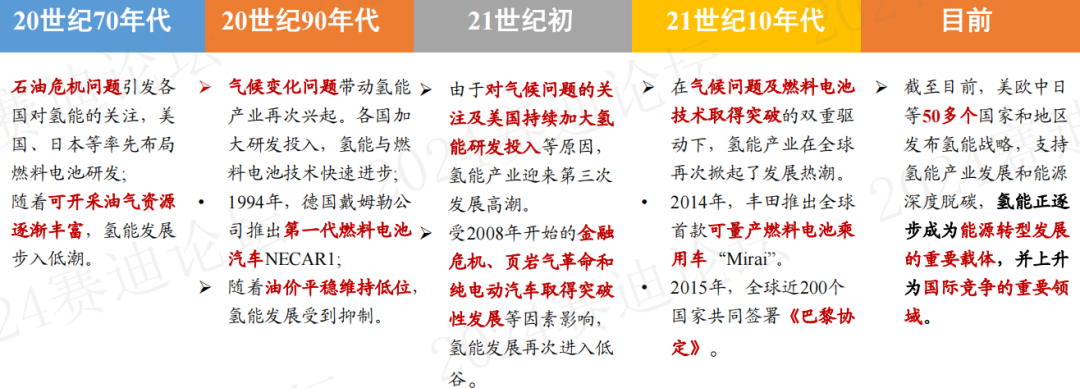 受政治经济、气候问题、化石能源价格波动、页岩气大规模开发、新能源和新能源汽车技术突破等因素影响,全球氢能产业发展经历了几起几落,正迎来新一轮发展浪潮。