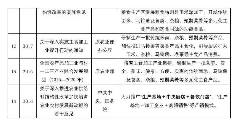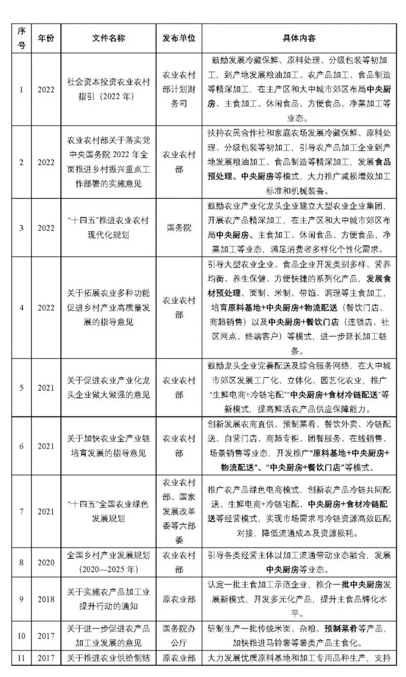 目前,国家层面尚无专门针对预制菜行业的支持政策,相关政策主要体现为对农产品加工、农村产业融合等方面的政策文件中,以“预制菜肴”“中央厨房”“食品预处理”为重点支持方向。下表梳理了从2016年至今的相关政策文件及其表述。