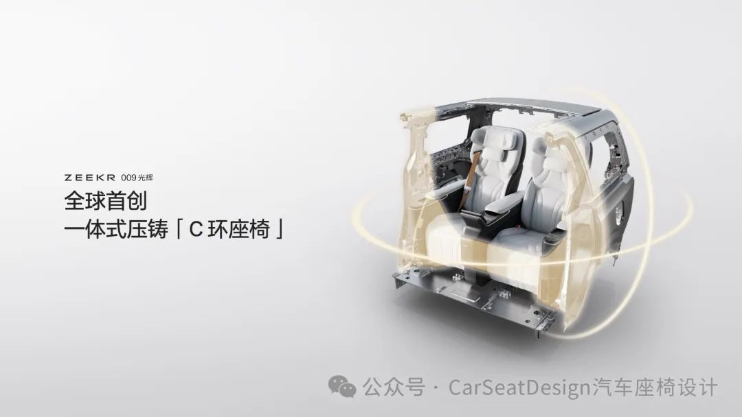 首先是全球首发一体式压铸「C环座椅」。极氪009光辉采用一体式压铸后端铝车身,将后排两个座椅,通过刚性连接,固定在整体大压铸件上刚度最高的C点位置,并与整个白车身连成完整C环,形成全方位、最坚固的结构保护,让二排乘客永远在最安全的“C位”。