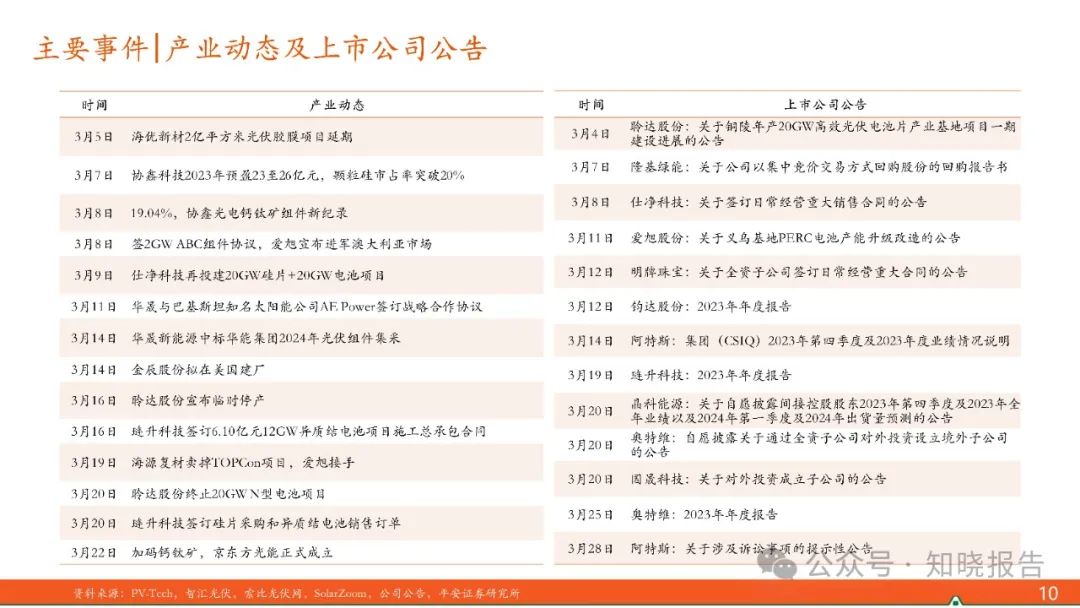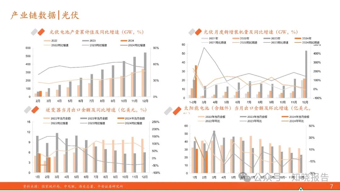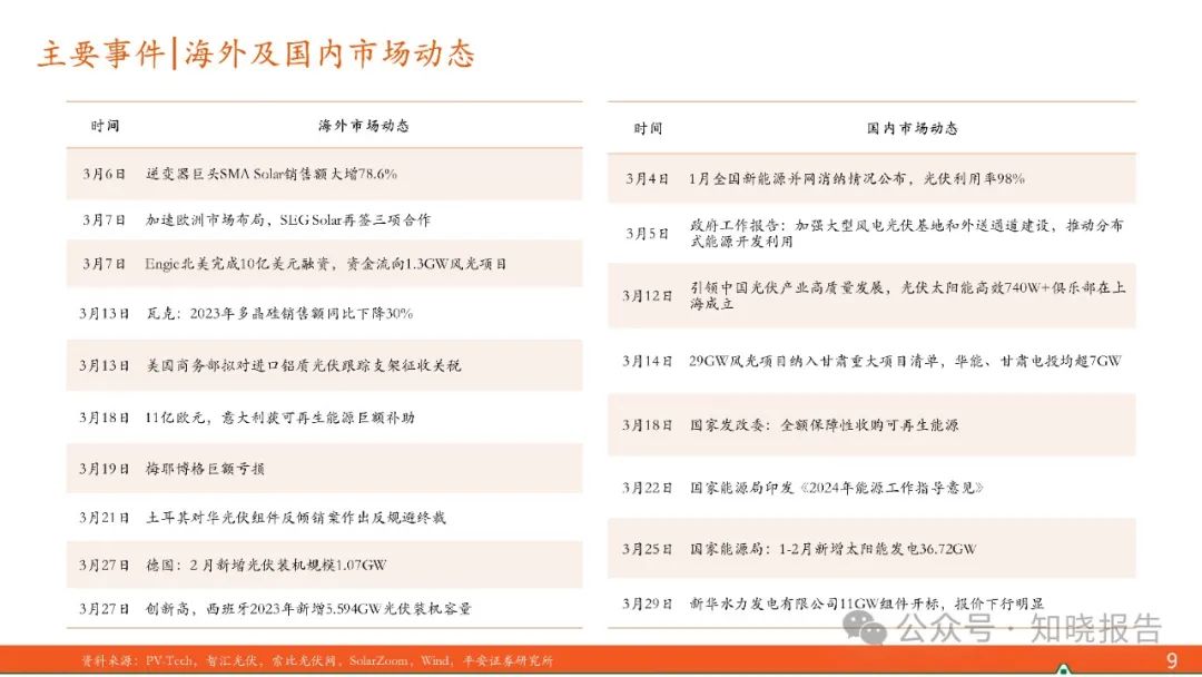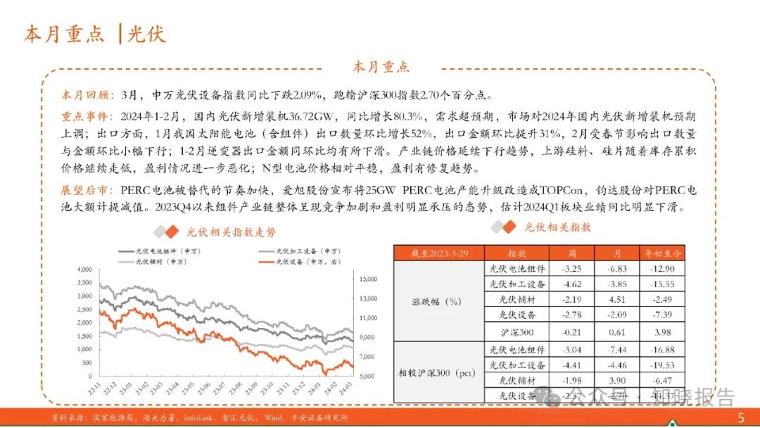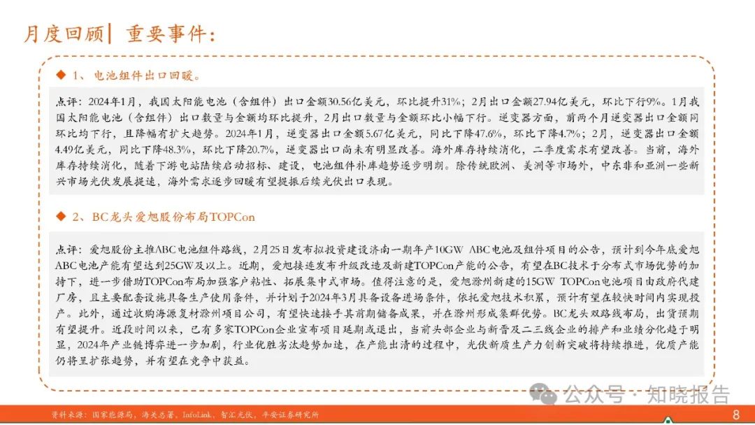 2024年1-2月,国内光伏新增装机36.72GW,同比增长80.3%,需求超预期,市场对2024年国内光伏新增装机预期上调;出口方面,1月我国太阳能电池(含组件)出口数量环比增长52%,出口金额环比提升31%,