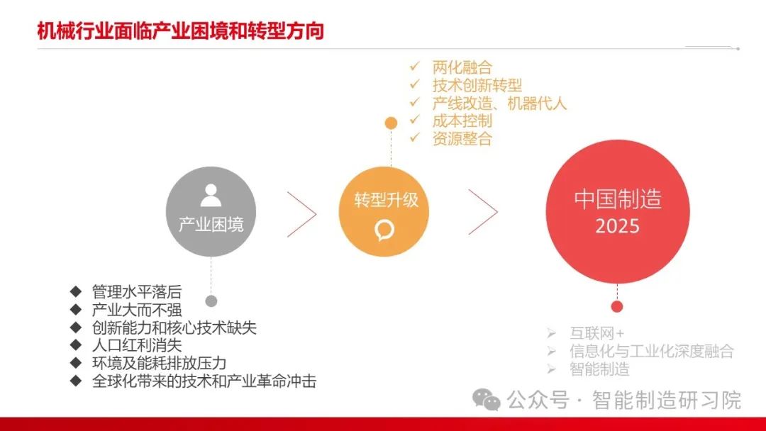 讨论了机械行业面临的产业困境和转型方向,包括两化融合、技术创新转型、产线改造、成本控制和资源整合等,并描述了机械行业管理模式的变化和数字化现状。