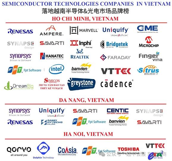 越南南部地区的胡志明市及其周边省份区域,经过十多年的电子产品发展历程,在产品研发、生产、组装、代工出口、外贸基地、物流等上下游产业链积聚了较强的产业基础,集中了越南全国52%以上的电子生产组装产能企业及68%电子科技研发人才,业已成为越南全国电子工业制造中心、消费大区及标杆城市。+ 国际巨头:苹果、三星、诺基亚、英特尔、安靠、LG、佳能、松下、康宁、肖特、伯恩光学等+ 中国大陆:京东方、立讯精密、比亚迪、海信、小米、兆驰、蓝思、TCL华星、歌尔、水晶光电、安洁科技、领益智造、舜宇光电、裕同科技、亚世光电、锦富技术、雷曼光电、高佳光电、深超光电、丘钛科技、泰禾光电、洋华光电、蓝通光电、亿晶光电、武汉凡谷、亨通光电、志超科技、中航光电、鸿日达、普为光电、中科光电、璨曜光电、源拓光电、大族粤铭、华工科技、鄂州智造、帝尔激光、鑫全利、广州新可、锐科激光、赛伍技术....等+ 台湾地区:富士康、鸿海、友达光电、和硕科技、瑞仪、英业达、中强光电、中光电、纬创等 + 日本企业:日东电工、松下、住友电木、富士通、民幸、丸和、Fujikura、旭硝子、电气硝子等+ 计划转移至越南的公司:英伟达、微软、谷歌、联想、任天堂等