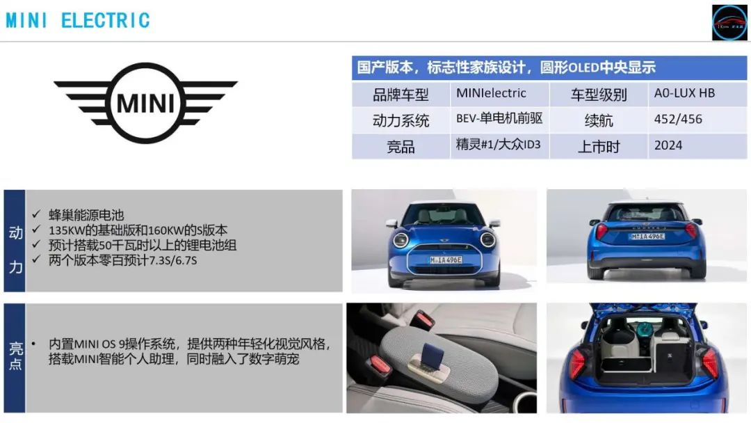 --内饰:与Cooper和Countryman采用相同的设计,即悬浮式圆形中控屏幕作为核心元素,取消传统的仪表盘,但配有HUD抬头显示进行补充,加上特殊织物面料覆盖的彩色中控台面,仍保留实体按键的中央控制区域,独特的方向盘造型,门板装饰等细节将MINI的复古精神和独特的科技感进行融合