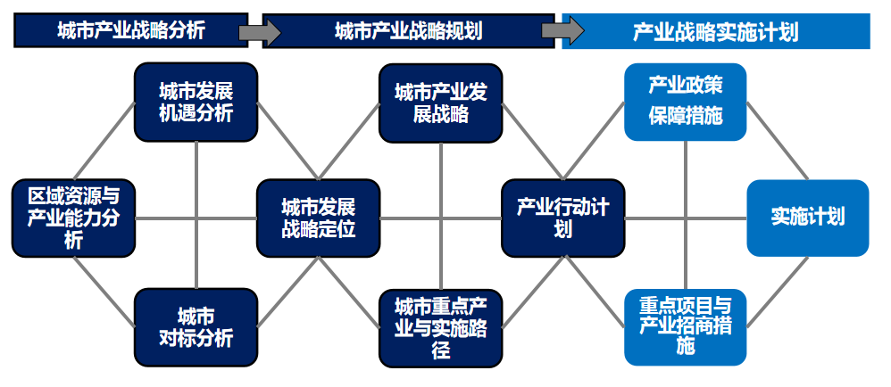 在开始产业规划前,首先可以运用产业增长领先模型(IGM),整合战略规划与执行的全过程,保障整个方案的完整性与系统性。本模型将产业规划划分为三大步。首先是城市产业战略分析阶段,主要是对城市内外部分析及战略定位研究过程;其次是城市产业战略规划阶段,主要是确定产业发展战略以及实施路径;最后是产业战略实施阶段,给出相应的产业发展政策和保障措施、招商实施计划等。
