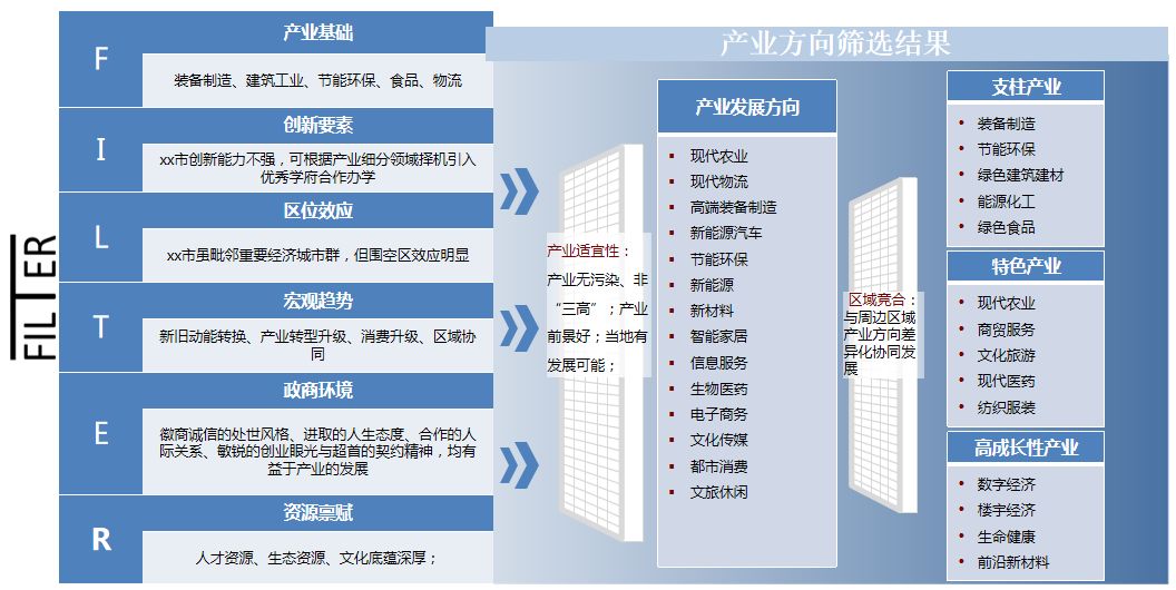 产业筛选阶段,可以运用FILTER模型,聚焦地区未来产业发展方向,产业基础、资源禀赋、创新要素、区位能级、政商环境、政府重点规划产业方向,得到未来聚焦产业方向。