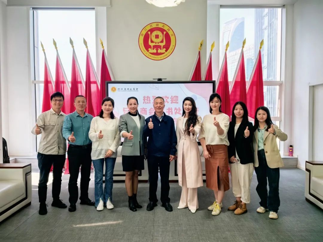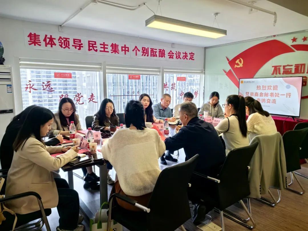 浙江省湖北商会副秘书长高萌代表秘书处对我们的到来表示了热烈欢迎,引领我们参观了商会的荣誉墙、文化墙、办公环境、党建室等。 随后与浙江省湖北商会副秘书长高萌、党委办主任刘华、办公室主任高婉茹、宣传部长孙洁、活动部长刘会伟、办公室干事范芸言、宣传干事王佳妮,及同时拜访的杭州市丽水商会秘书长商良勇、副秘书长麻俊芝,杭州市缙云商会秘书长郑培俊,共13人在湖北商会会议室开展座谈交流活动。