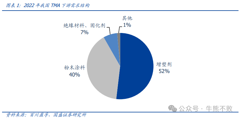 资料显示,TMA(偏苯三酸酐)是一种主要用于增强下游耐热性的化学原料,现阶段暂无替代品。2022年我国TMA需求量12.5万吨,其中增塑剂、粉末涂料需求占比分别为52%、40%,合计占比高达92%,为TMA的核心下游。