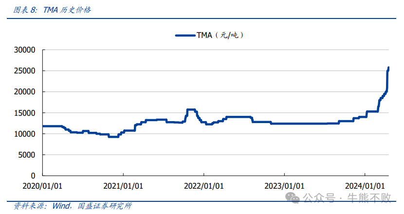 华金证券骆红永在4月14日的研报中表示,据百川盈孚资讯,3月左右美国某7万吨TMA工厂传出爆炸听闻,后又传永久关停通知,供应端产量骤减,为TMA价格上涨提供支撑。年后至今,国内市场TMA现货流动整体偏紧,加之美国工厂停产,国内TMA进口数量减少,出口订单增多,工厂生产现货流向国内市场数量再度缩减。