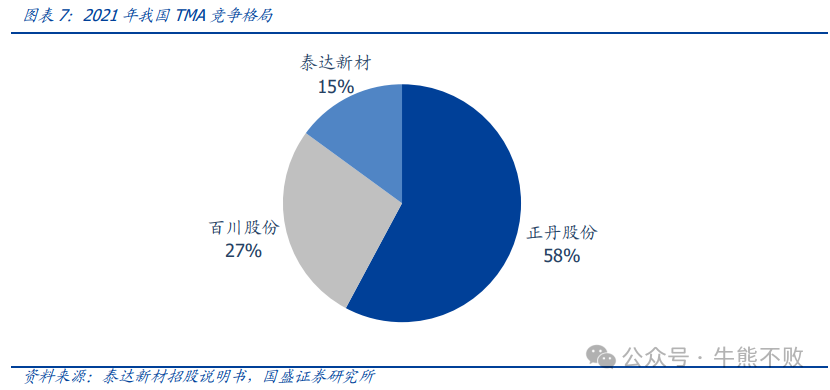 近年来海外TMA供给持续退出,行业逐步形成高度垄断的寡头竞争格局。2006年海外产能占全球TMA总产能的87%,然而截至2016年底,国际企业中BP-Amoco的马来西亚和比利时工厂、德国 Saarbergwerk、日本大赛珞、日本三菱瓦斯的TMA装置均已关闭或停产。截至2022年H2,海外正常生产的企业主要仅有美国英力士等少数企业。国内方面,随着2021年波林化工TMA关停,正丹股份、百川股份和泰达新材三家厂商占据几乎所有产能,产能分别为8.5万吨、4万吨、2.2万吨。