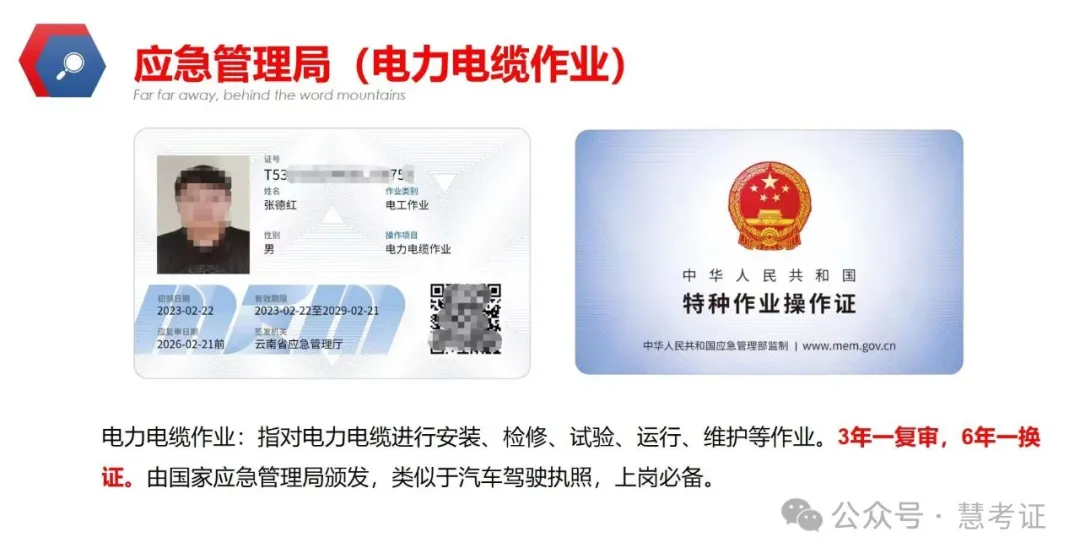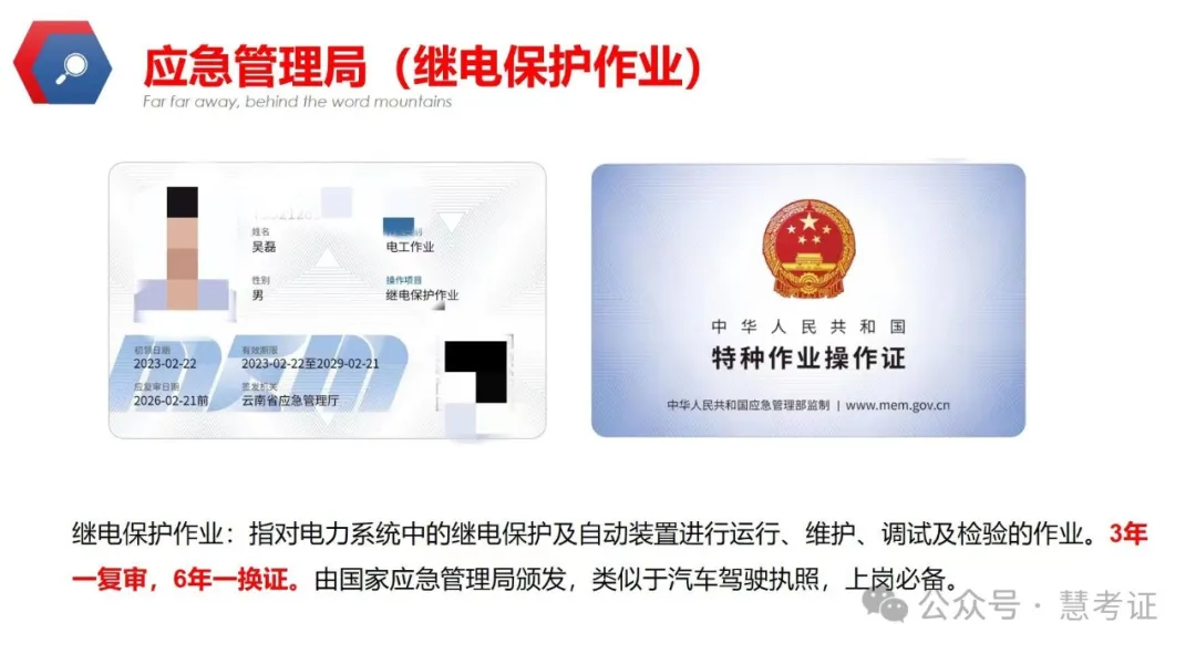 六、电工进网作业许可证:电工进网作业许可证,分为特高类、高压类、低压类。是由国家能源局颁发,2017年12月份起,新证已停发,如持有老证先换为应急管理的高压电工证,再审证,审证可保留工龄。
