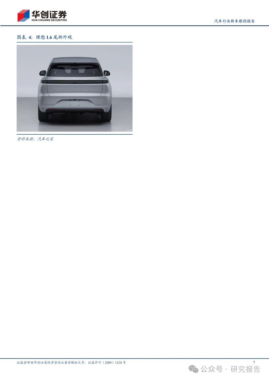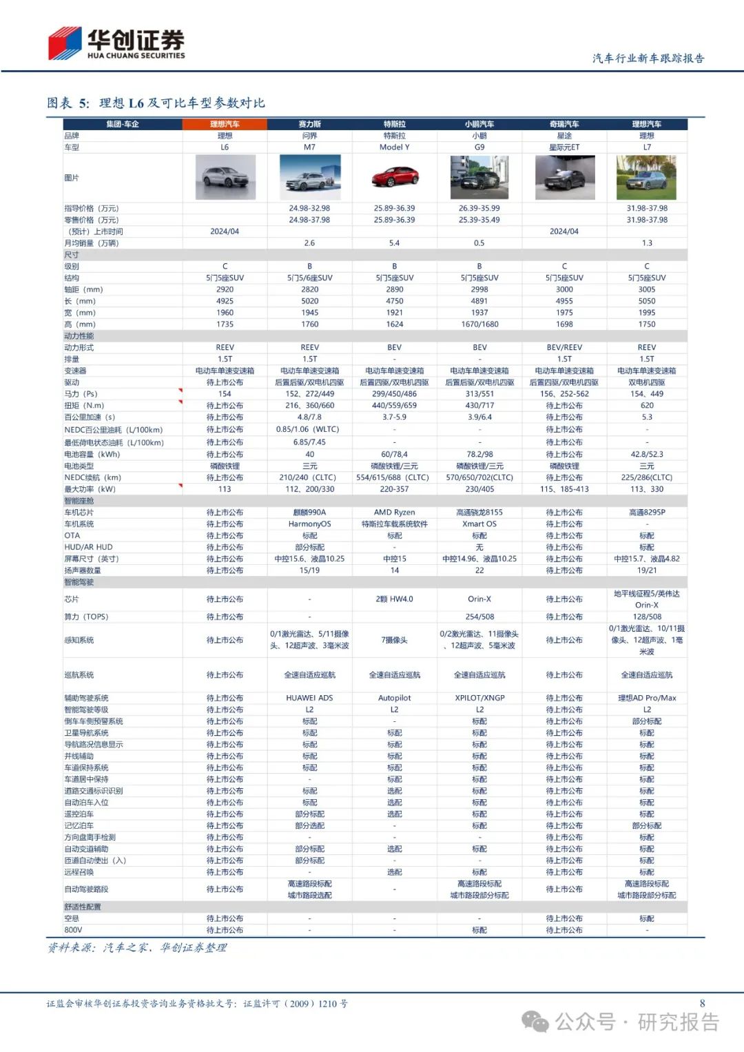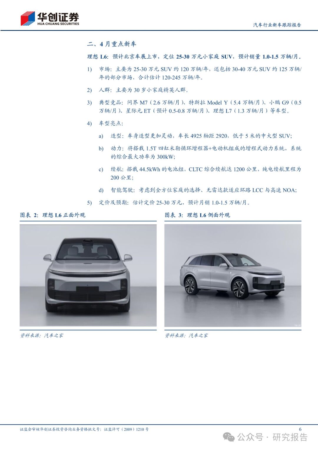 理想 L6:预计北京车展上市,定位 25-30 万元小家庭 SUV,预计销量 1.0-1.5 万辆/月。主要市场为 25-30 万元 SUV 约 120 万辆/年,还包括 30-40万元 SUV 约 125 万辆/年的部分市场,合计估计 120-245 万辆/年。L6 作为理想切入 30 万元以下 SUV 市场首款车型,市场关注较高。