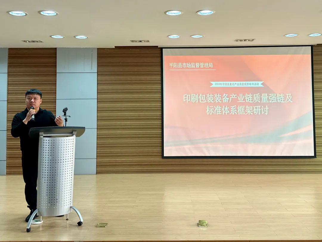 会议由杭州汉德质量认证服务有限公司高级工程师张晓斌、浙江理工大学向忠教授分别就“品字标”浙江制造认证解读、机器视觉技术在包装印刷质量检测中的应用进行深入介绍。此外,会议还聚焦印刷包装装备产业链质量提升与标准体系构建,以期共同推动该领域的发展。平阳县市场监管局党委委员、副局长宋进胜在会议上进行致辞,平阳县市场监管局科长刘洪暖、科长金士卡在现场指导。会议由浙江省标准化研究院高级工程师苏文担任主持,吸引了40余家平阳县印刷包装装备制造企业的代表踊跃参与,共同探讨行业前沿技术与市场发展趋势。