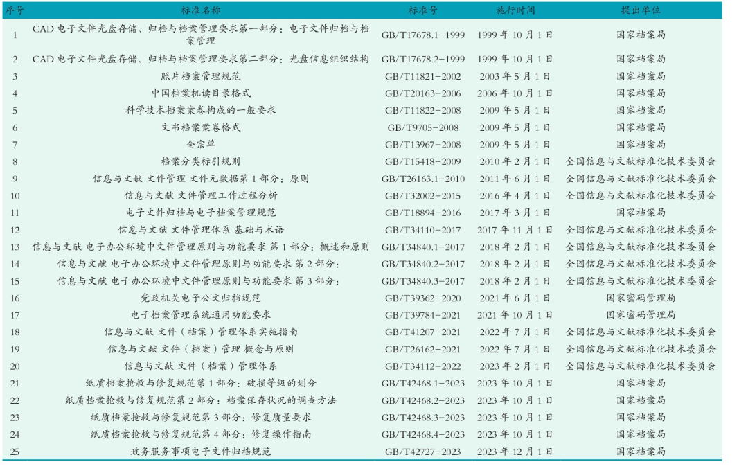 我国已发布国家标准 4 万余项、行业标准 7.6 万 余项、地方标准 5.3 万余项,5000多家社会团体公布了3万余项团体标准,自我声明公开企业标准184万余项。与档案相关的各类标准有130余项,涉及档案整理、电子文件管理、档案馆建筑等领域。目前现行有效的档案相关的国家标准有 45项(根据互联网 开源信息),其中信息化相关的有16项,由国家档案局提出的有14项,国家档案局网站档案标准库公布的国家标准共25项具体见表1。