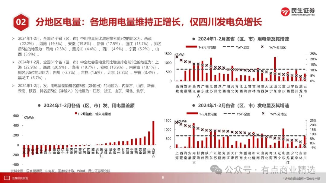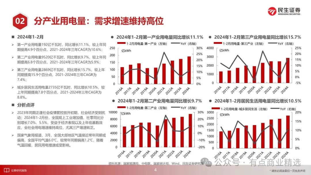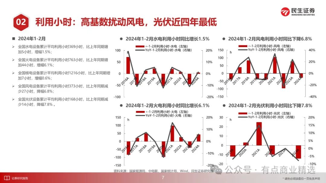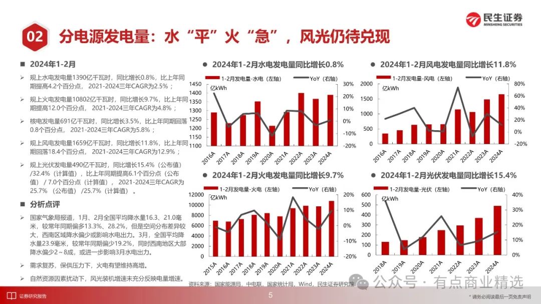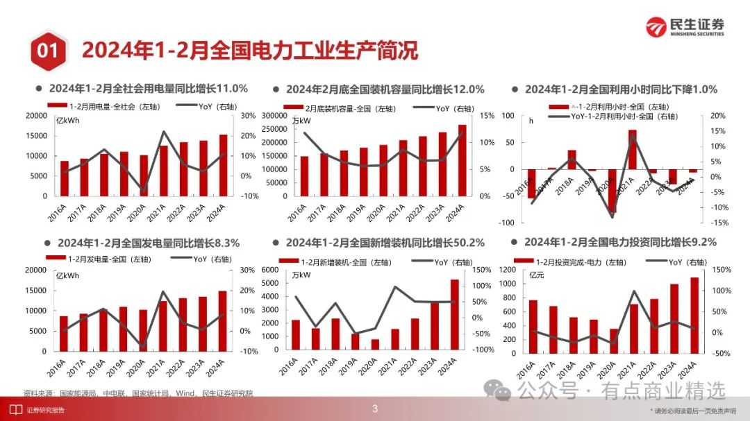 1-2月份,全社会用电量1.53万亿千瓦时,同比增长11.0%,2021-2024年三年CAGR为6.8%;全国规上电厂发电量1.49万亿千瓦时,同比增长8.3%,三年CAGR为6.2%;发电设备累计平均利用小时563小时,同比减少6小时,降幅1.0%。