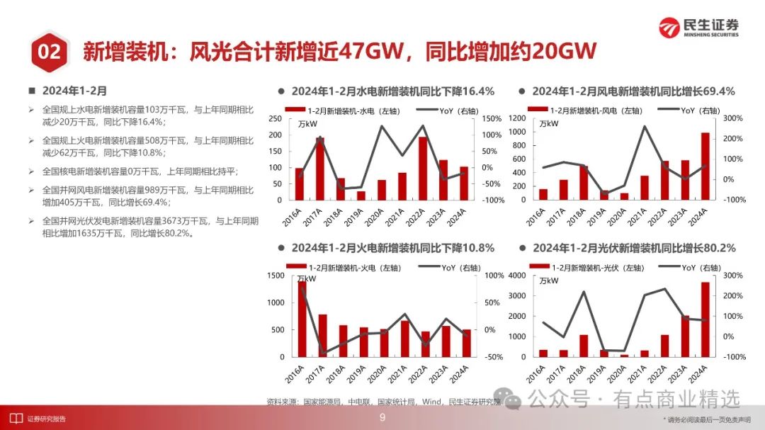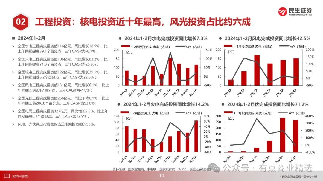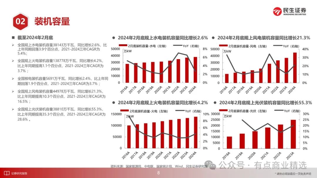 截至2月底,规上电厂装机容量26.64亿千瓦,同比增长12.0%,三年CAGR为8.4%;1-2月份,新增装机容量5272万千瓦,比上年同期多投产1761万千瓦,增幅50.2%;主要电力企业电源及电网工程合计完成投资1088亿元,同比增长9.2%,三年CAGR为15.4%。