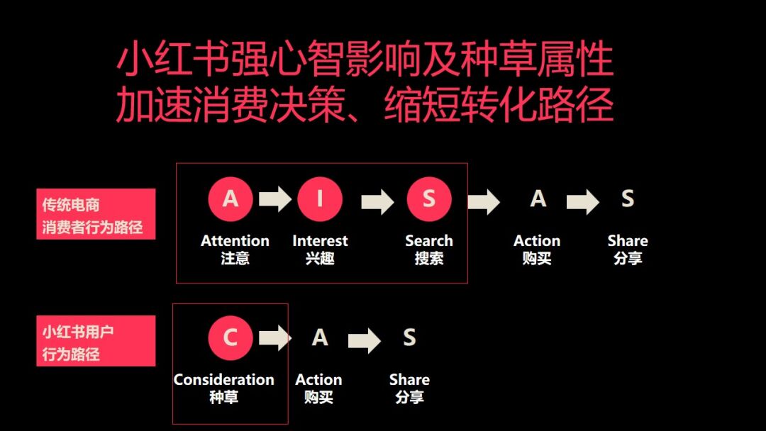传统的电商消费者行为路径通常涉及五个阶段:注意、兴趣、搜索、购买到分享。而小红书用户的行为路径大为简化,从种草到购买再到分享,整个过程迅速减少,极大提高了效率。