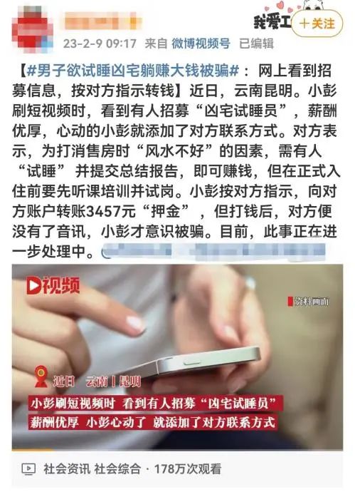 前段时间,云南昆明的一个小伙子小彭,就是因为在刷短视频时看到凶宅试睡员招募且薪酬优厚的消息,心动地报了名。