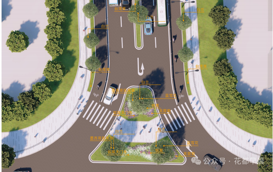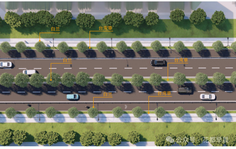 花都区广花公路以东、雅瑶中路以南 CA1207006、CA1207019 地块市政设计项目节点主要有一个交叉口。路幅较宽,相比绿化面积显小,考虑植物的层次、植物线性的思维空间,花都区广花公路中央绿化带以白兰为主要基调,搭配海绵沟的台湾草,形成生态自然的艺术效应。花都区广花公路两侧绿化带以白兰为主,下层微地形种植台湾草,简约大方,效果明显,尽显瘦漏之美。