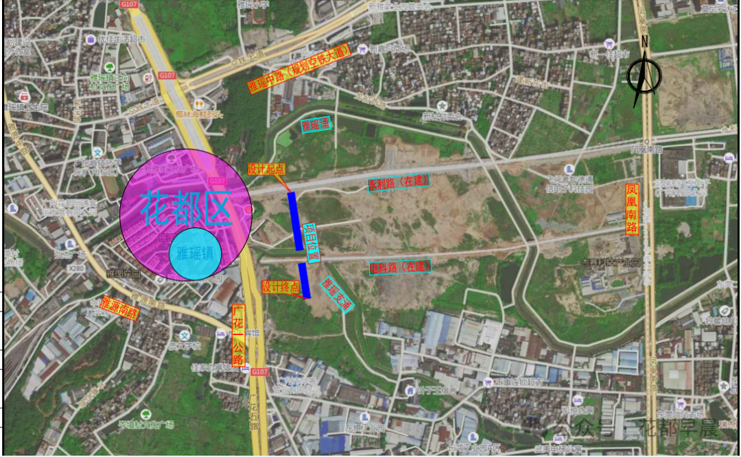 本项目设计道路次干路四位于花都区新雅街,项目西临近广花一级公路、东靠曙光路、北面雅瑶新村、南向东莞村。为城市次干路,总长约 327m,规划红线宽度30 米,设计速度40公里/小时,为城市次干路,采用双向四车道布设,路面结构采用沥青混凝土。