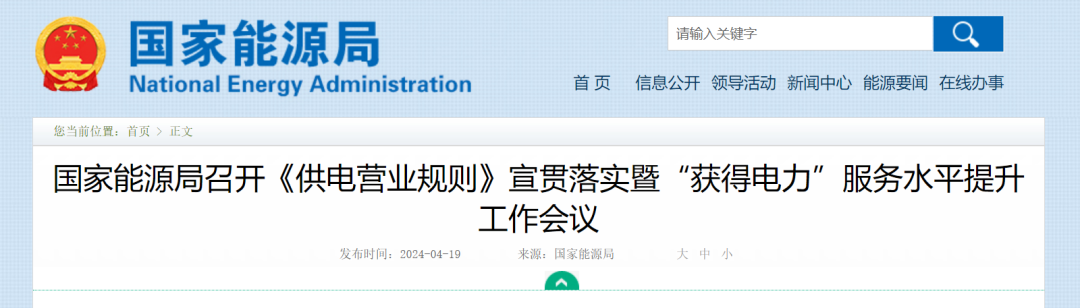 4月19日,国家能源局在京召开《供电营业规则》(以下简称《规则》)宣贯落实暨“获得电力”服务水平提升工作会议。国家能源局党组成员、副局长宋宏坤出席会议并讲话。