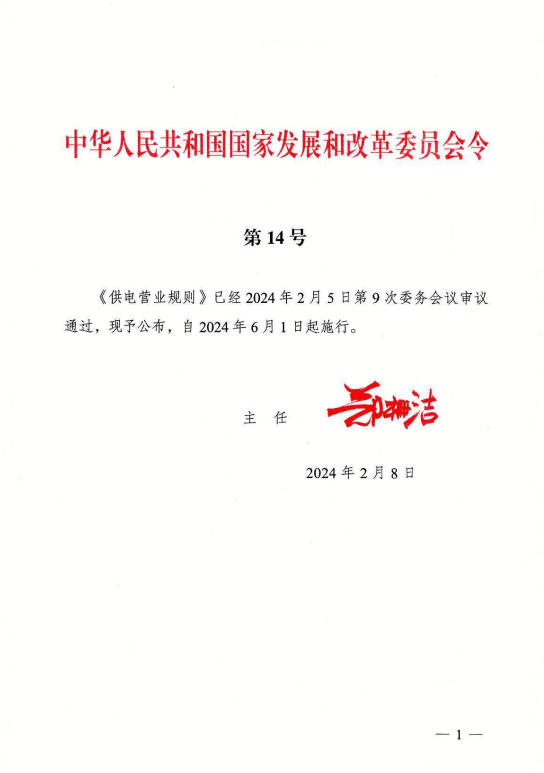 《供电营业规则》已经2024年2月5日第9次委务会议审议通过,现予公布,自2024年6月1日起实行,具体文件内容如下: