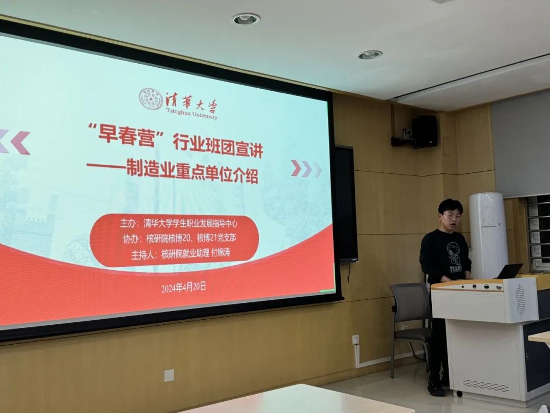 清华大学学生职业发展指导中心与核研院核博20、核博21党支部联合举办的“早春营”行业班团宣讲活动于2024年4月20日晚在能科楼A114教室顺利举行。本次活动面向全校同学,共吸引了20余位同学线下参与,同时还有60余位同学通过线上渠道同步参与,共同探讨制造业的职业发展机遇。