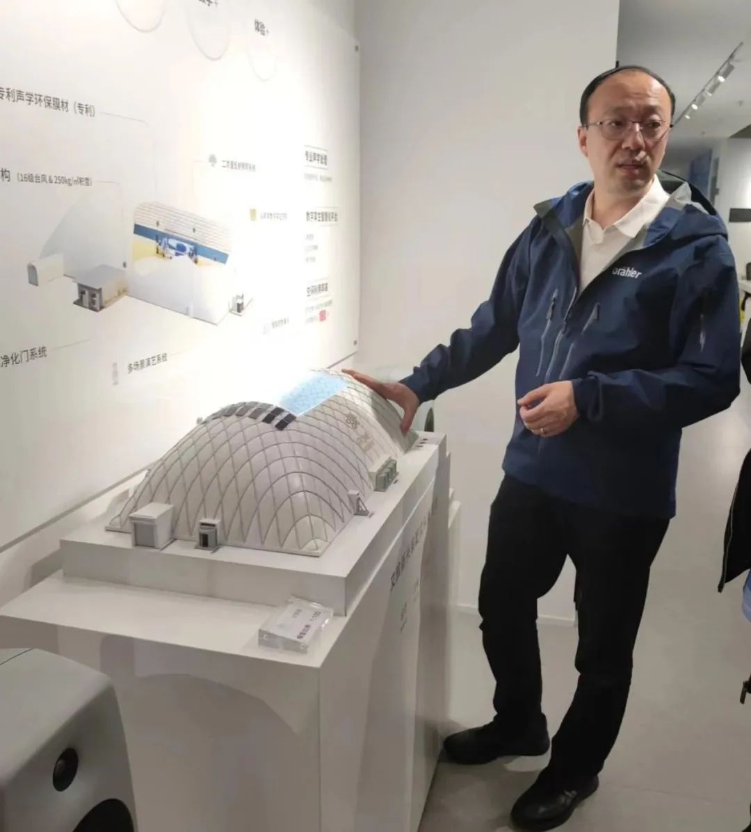 执行会长侯天宇先生带领与会成员参观了百音集团的办公区,深入了解公司的企业文化、发展历程以及技术创新。大家对百音集团在气膜建筑场馆声学技术领域的突破表示高度赞赏,这一创新技术为百音集团在声学应用行业奠定了行业翘楚的地位。