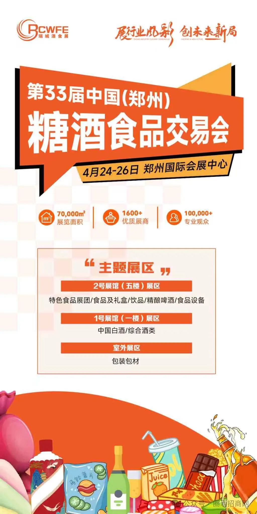 第33届郑州糖酒会规划展览面积70000㎡,设置了综合酒类展区、国际进口酒展区、食品及礼盒展区、精酿啤酒展区、特色食品展团、精品饮料展区、食品设备展区、包装包材展区8个专题展区,拟邀请1600家优质企业参展。本届展会展品涵盖各香型白酒、进口烈酒、低度酒饮、精酿啤酒、葡萄酒、果酒、休闲食品、方便速食、进口食品、地方特产、烘焙食品、膨化食品、食品礼盒、肉制熟食、粮油调味品、农副食品、精品饮品、乳制品、果汁饮料、碳酸饮料、功能饮料、茶饮料、饮用水、咖啡饮料、各种食品加工机械、食品包装机械、食品检测仪器、厨房设备、各种包装包材等,预计将吸引100000余专业观众到场参观、看品选品、贸易采购。4月24-26日,让我们再次相约郑州国际会展中心,共襄第33届郑州糖酒会,共探增长路径,共赢食业未来!