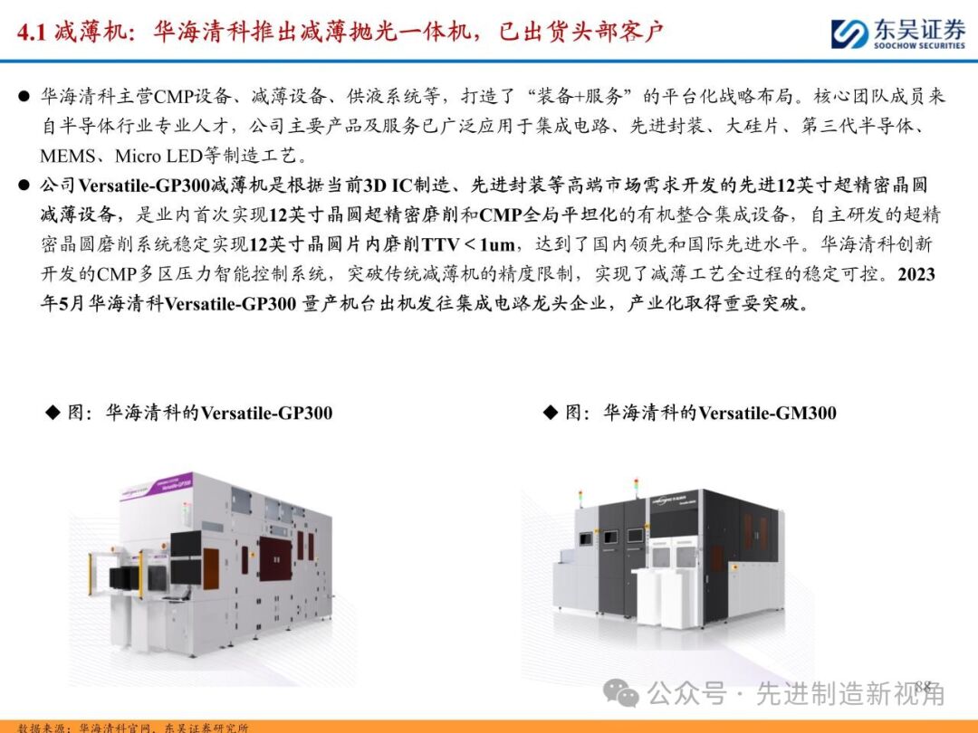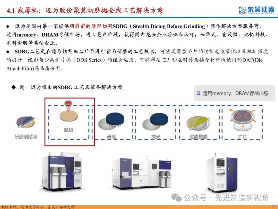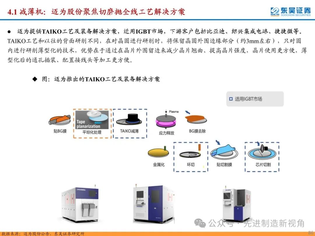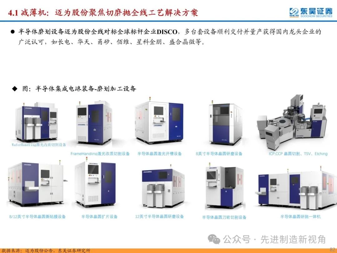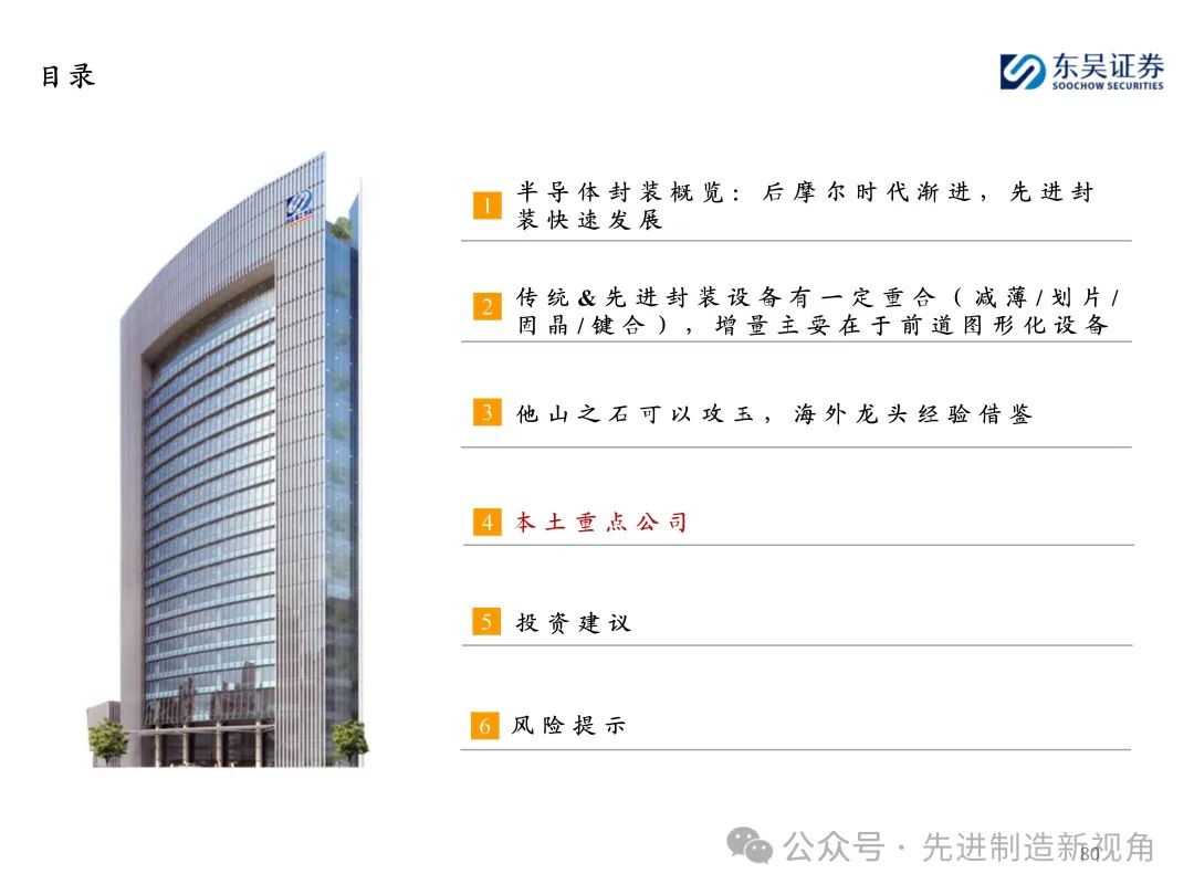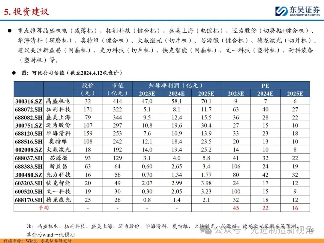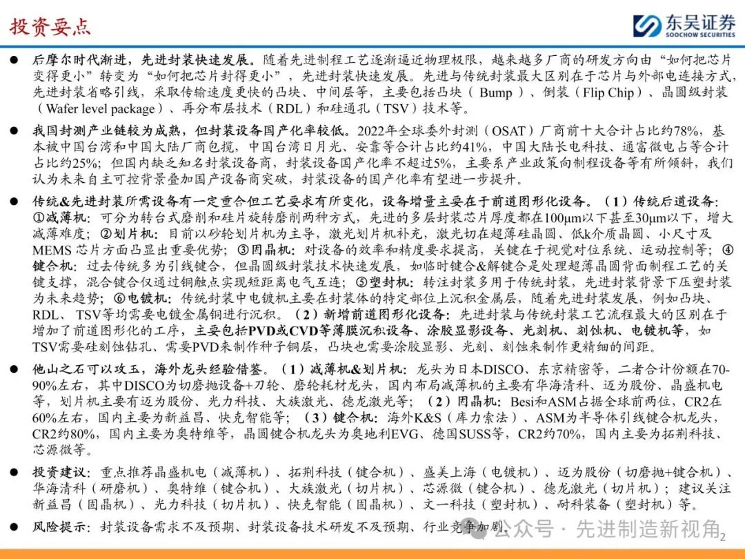 重点推荐晶盛机电(减薄机)、拓荆科技(键合机)、盛美上海(电镀机)、迈为股份(切磨抛+键合机)、华海清科(研磨机)、奥特维(键合机)、大族激光(切片机)、芯源微(键合机)、德龙激光(切片机);建议关注新益昌(固晶机)、光力科技(切片机)、快克智能(固晶机)、文一科技(塑封机)、耐科装备(塑封机)等。