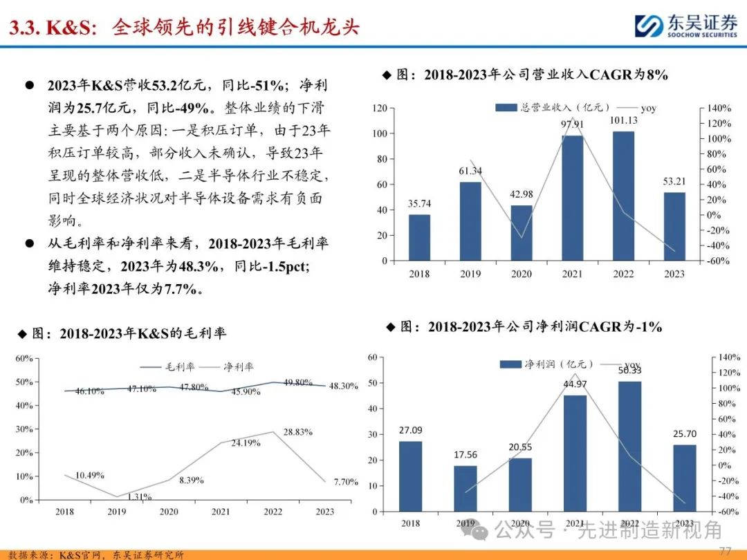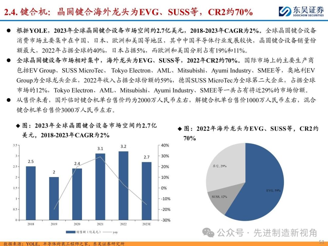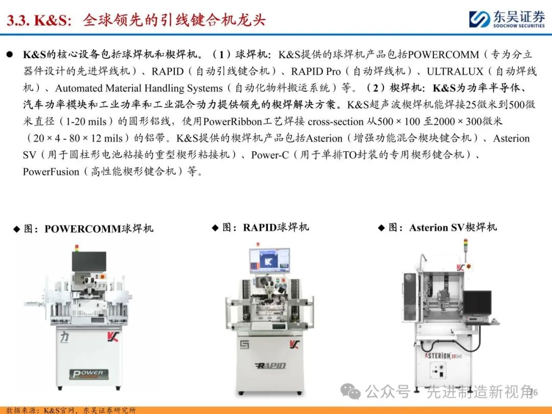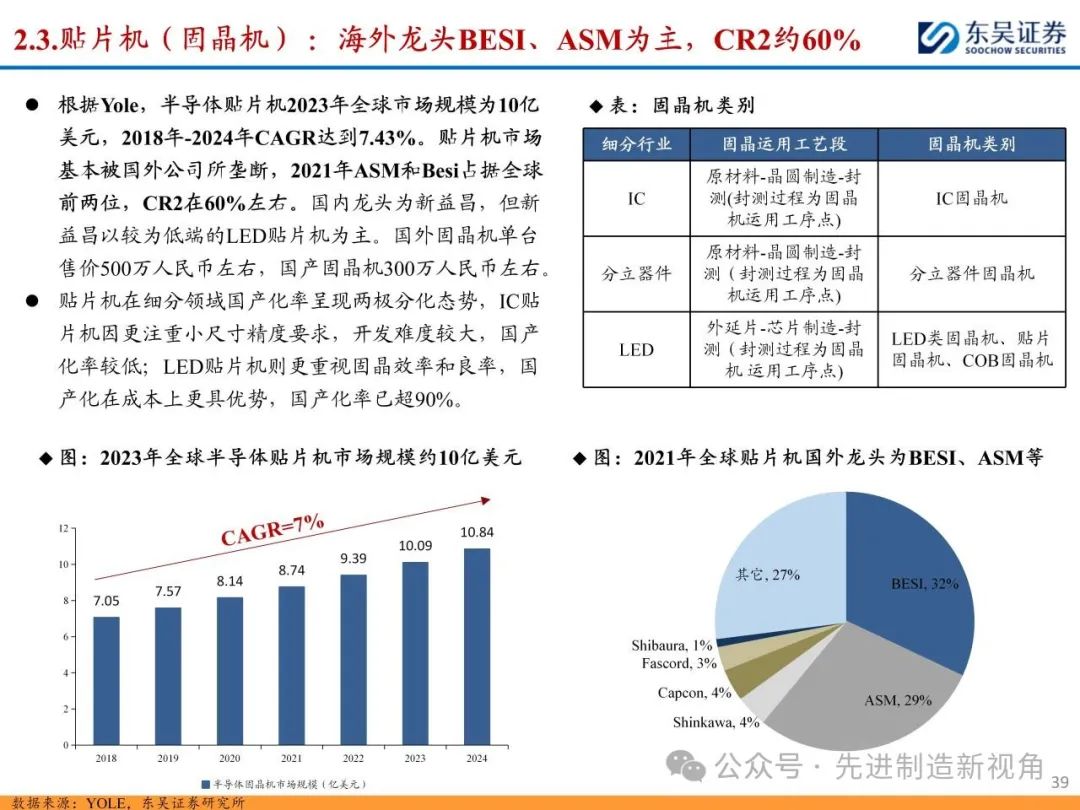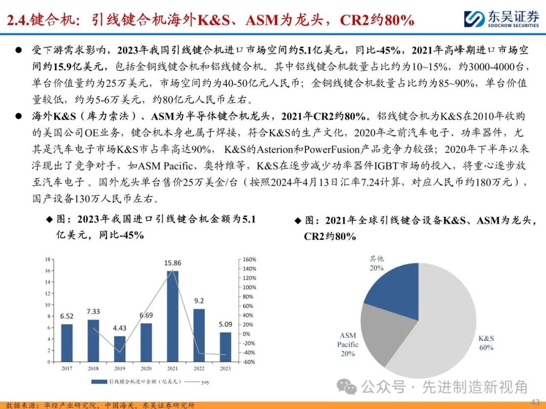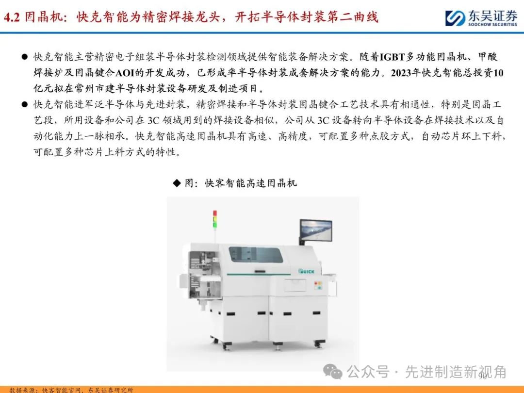 (1)减薄机&划片机:龙头为日本DISCO、东京精密等,二者合计份额在70-90%左右,其中DISCO为切磨抛设备+刀轮、磨轮耗材龙头,国内布局减薄机的主要有华海清科、迈为股份、晶盛机电等,划片机主要有迈为股份、光力科技、大族激光、德龙激光等;(2)固晶机:Besi和ASM占据全球前两位,CR2在60%左右,国内主要为新益昌、快克智能等;(3)键合机:海外K&S(库力索法)、ASM为半导体引线键合机龙头,CR2约80%,国内主要为奥特维等,晶圆键合机龙头为奥地利EVG、德国SUSS等,CR2约70%,国内主要为拓荆科技、芯源微等。