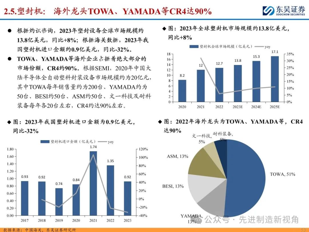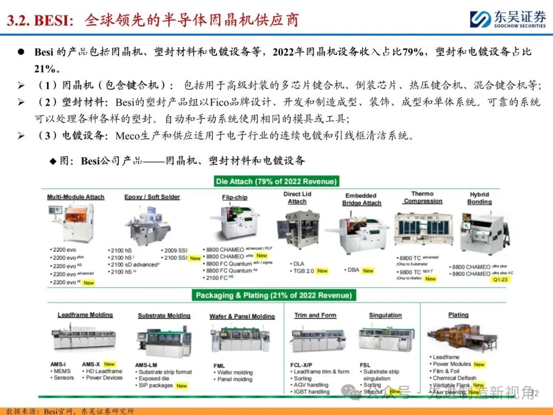 2022年全球委外封测(OSAT)厂商前十大合计占比约78%,基本被中国台湾和中国大陆厂商包揽,中国台湾日月光、安靠等合计占比约41%,中国大陆长电科技、通富微电占等合计占比约25%;但国内缺乏知名封装设备商,封装设备国产化率不超过5%,主要系产业政策向制程设备等有所倾斜,我们认为未来自主可控背景叠加国产设备商突破,封装设备的国产化率有望进一步提升。