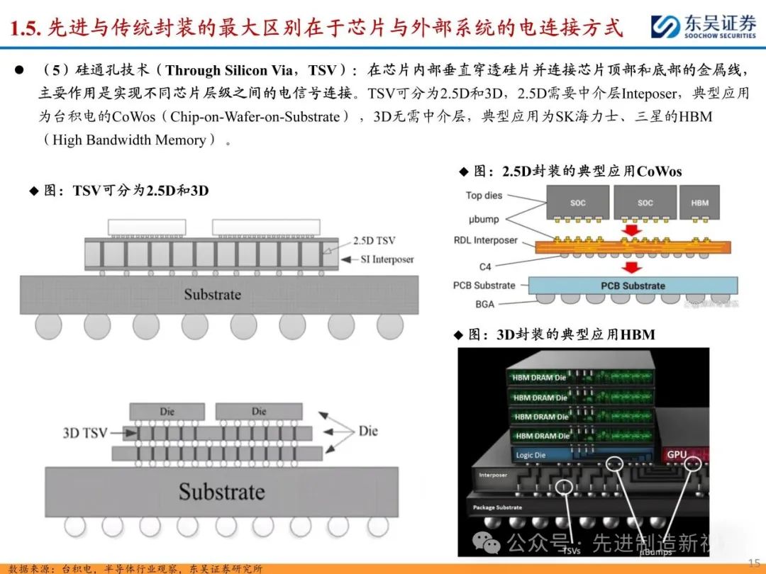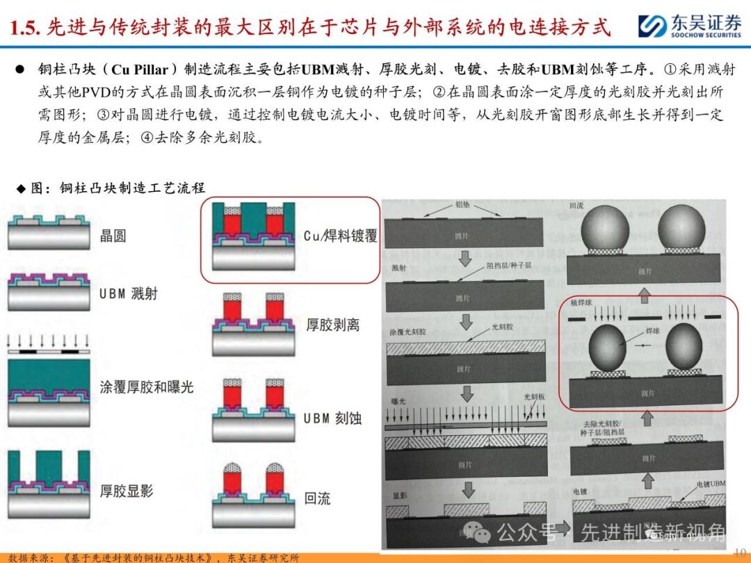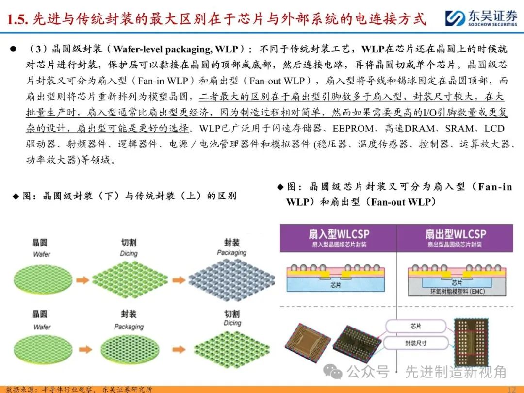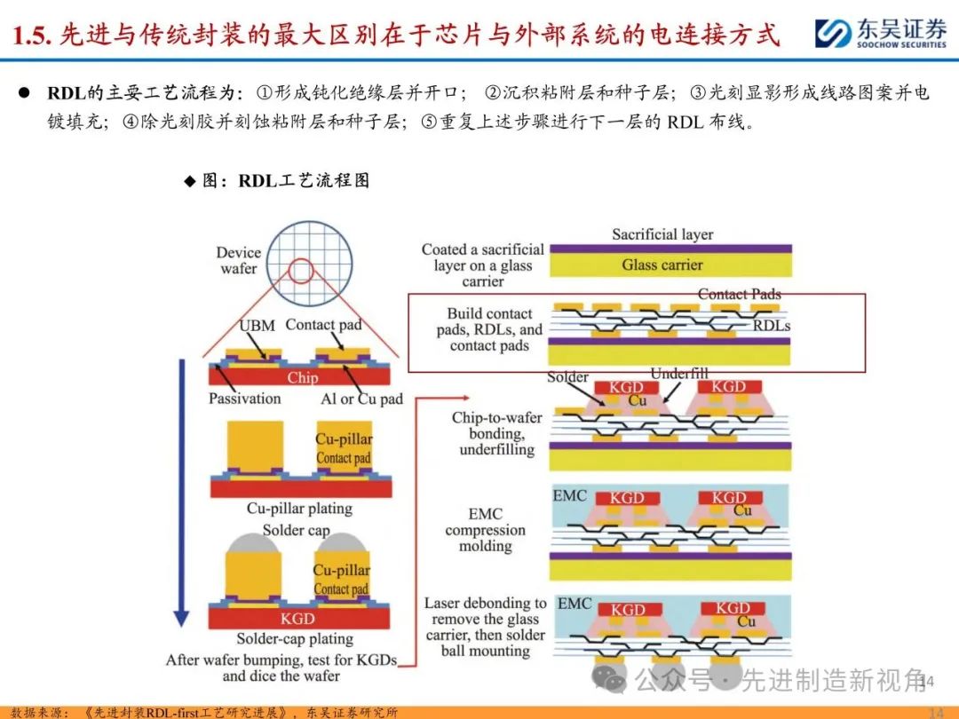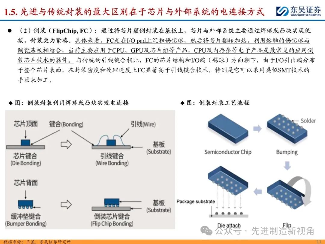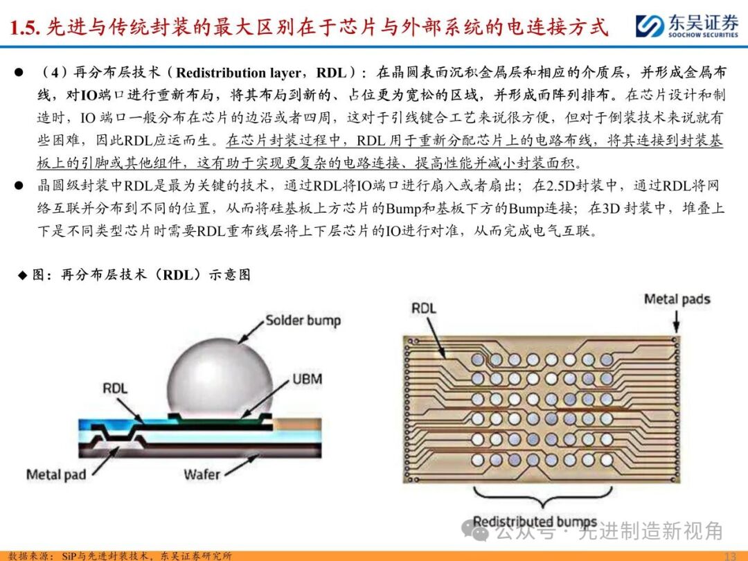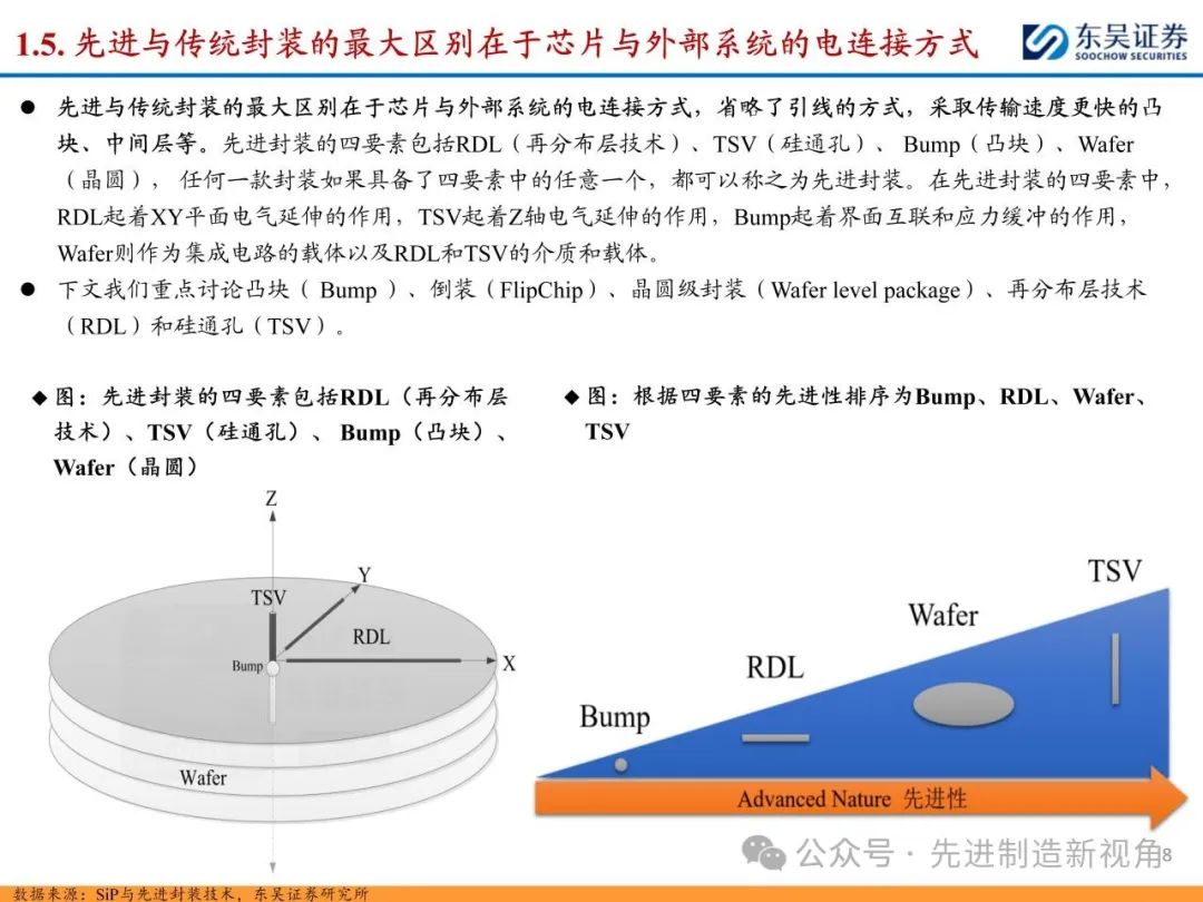 随着先进制程工艺逐渐逼近物理极限,越来越多厂商的研发方向由“如何把芯片变得更小”转变为“如何把芯片封得更小”,先进封装快速发展。先进与传统封装最大区别在于芯片与外部电连接方式,先进封装省略引线,采取传输速度更快的凸块、中间层等,主要包括凸块( Bump )、倒装(Flip Chip)、晶圆级封装(Wafer level package)、再分布层技术(RDL)和硅通孔(TSV)技术等。
