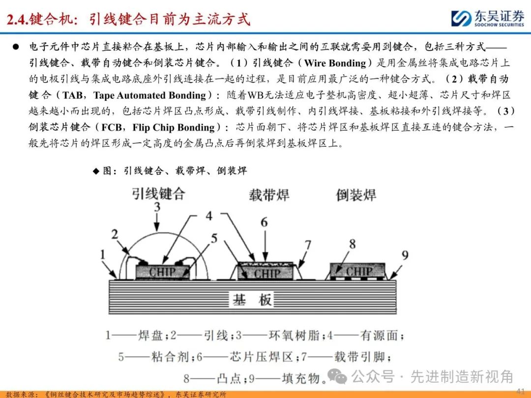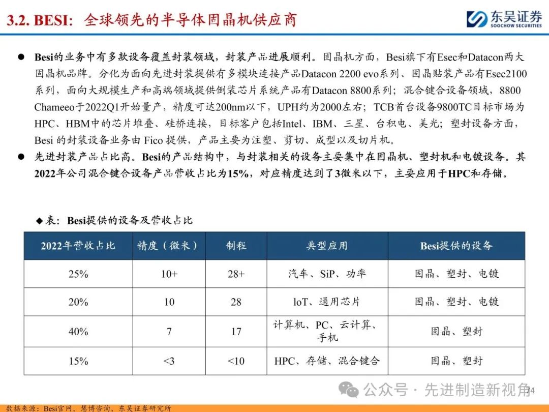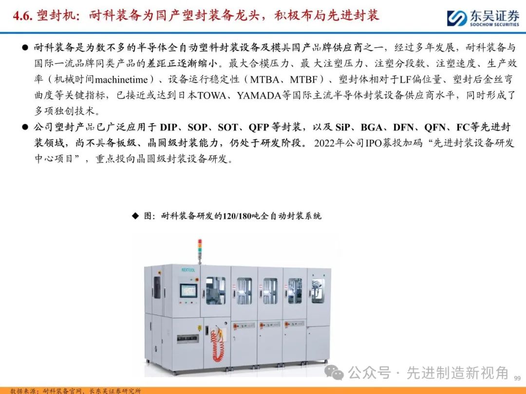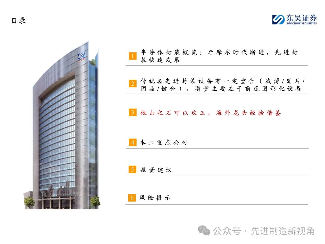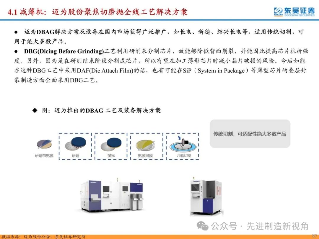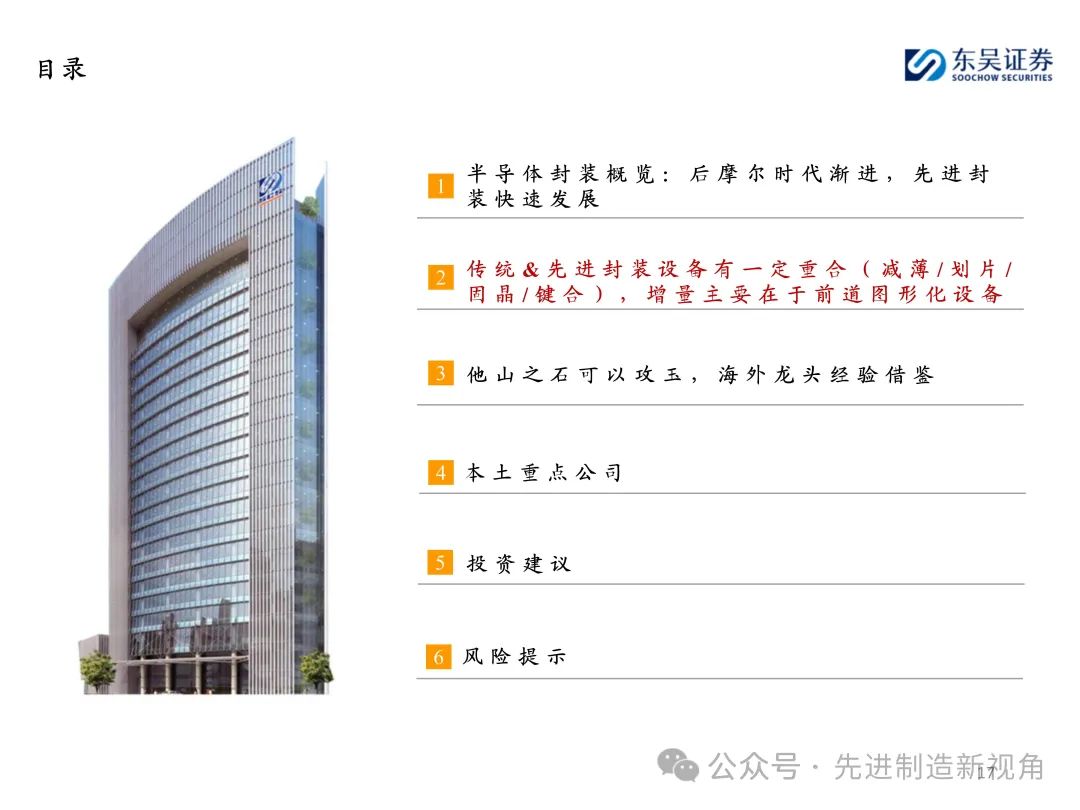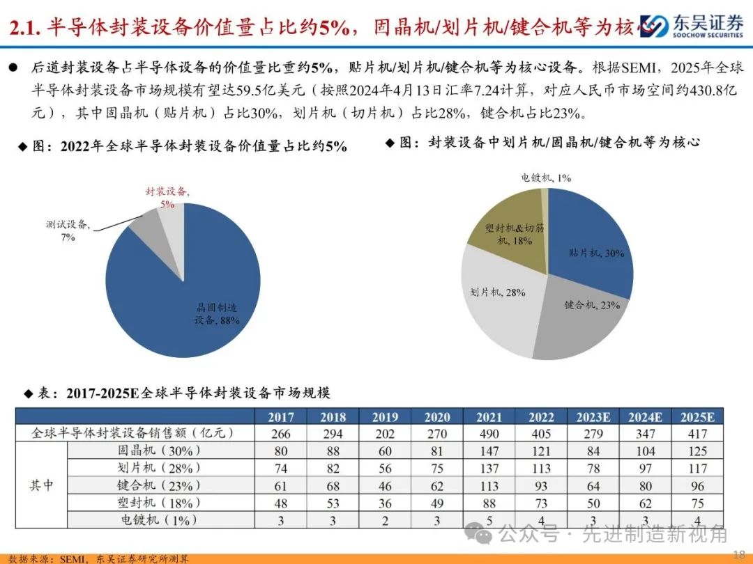 (1)传统后道设备:①减薄机:可分为转台式磨削和硅片旋转磨削两种方式,先进的多层封装芯片厚度都在100μm以下甚至30μm以下,增大减薄难度;②划片机:目前以砂轮划片机为主导,激光划片机补充,激光切在超薄硅晶圆、低k介质晶圆、小尺寸及 MEMS 芯片方面凸显出重要优势;③固晶机:对设备的效率和精度要求提高,关键在于视觉对位系统、运动控制等;④键合机:过去传统多为引线键合,但晶圆级封装技术快速发展,如临时键合&解键合是处理超薄晶圆背面制程工艺的关键支撑,混合键合仅通过铜触点实现短距离电气互连;⑤塑封机:转注封装多用于传统封装,先进封装背景下压塑封装为未来趋势;⑥电镀机:传统封装中电镀机主要在封装体的特定部位上沉积金属层,随着先进封装发展,例如凸块、 RDL、 TSV等均需要电镀金属铜进行沉积。
