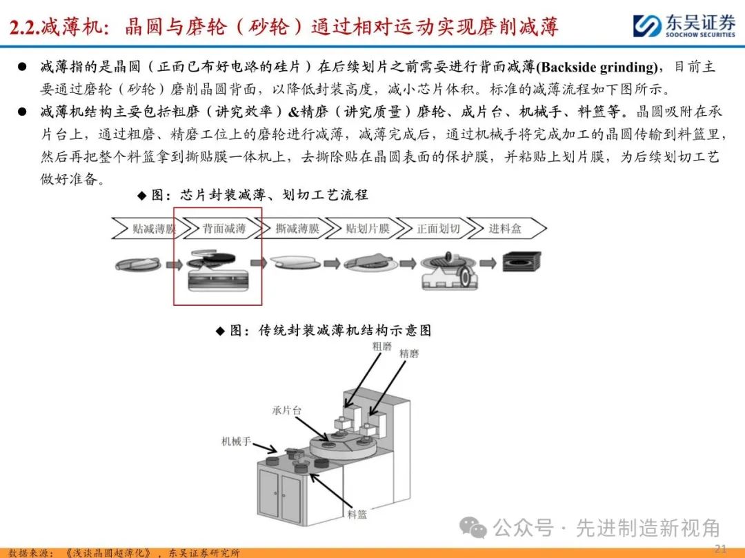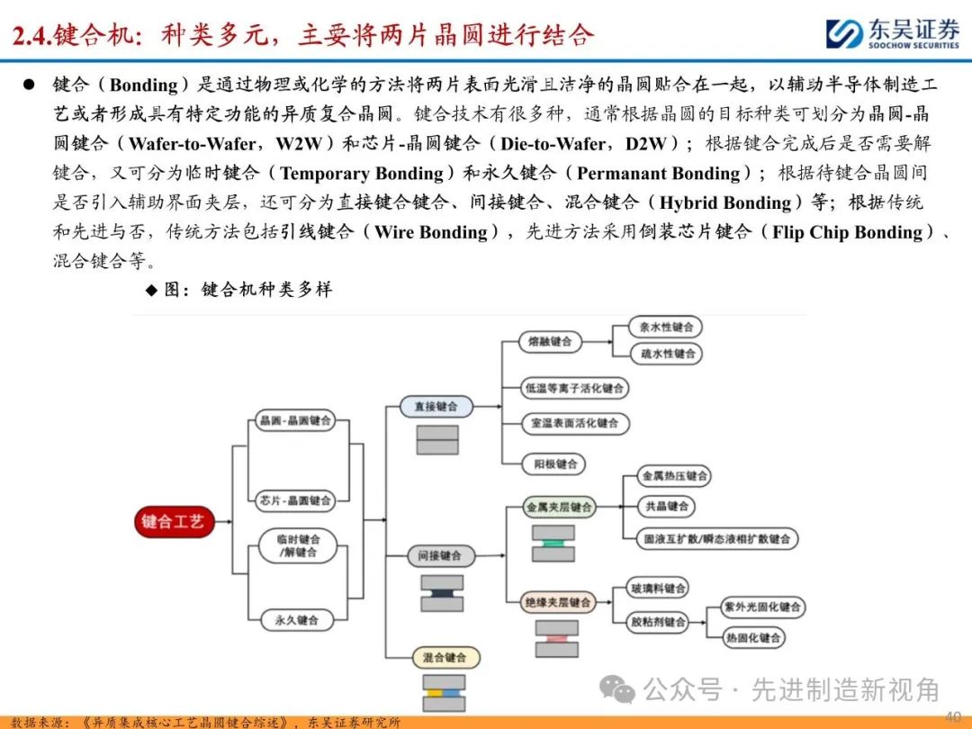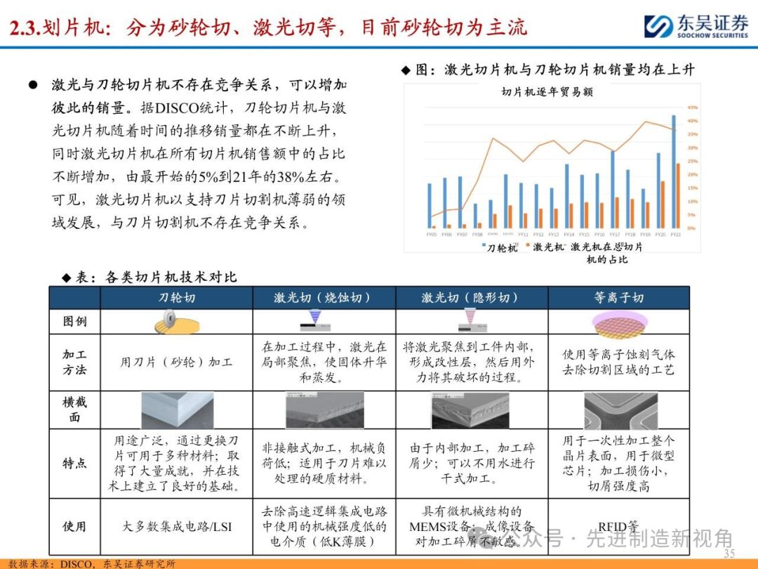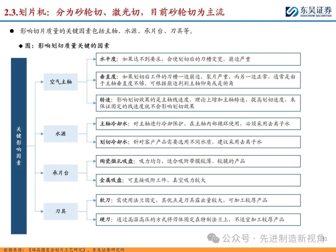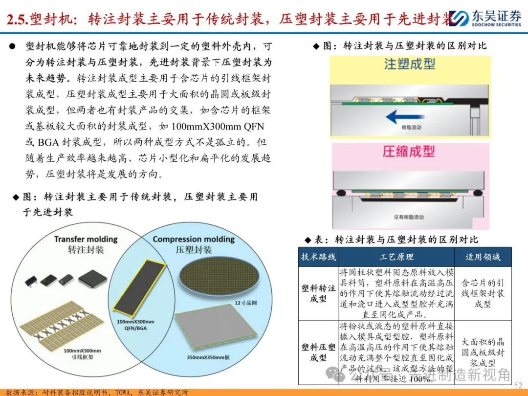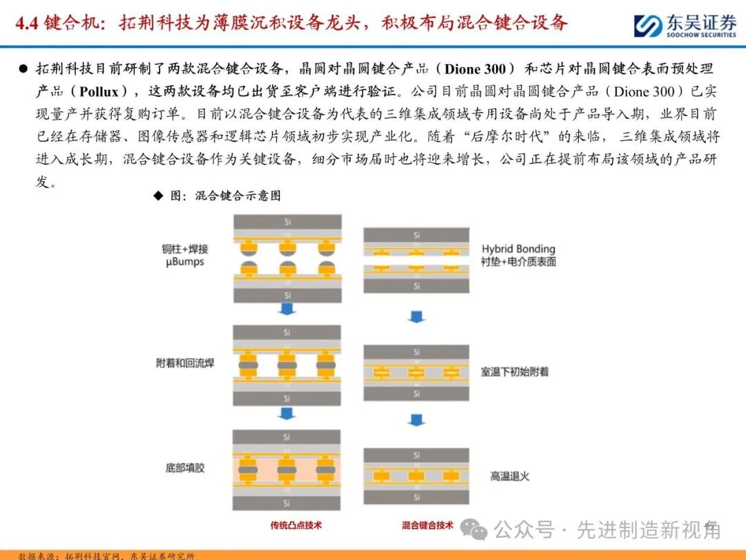 (1)传统后道设备:①减薄机:可分为转台式磨削和硅片旋转磨削两种方式,先进的多层封装芯片厚度都在100μm以下甚至30μm以下,增大减薄难度;②划片机:目前以砂轮划片机为主导,激光划片机补充,激光切在超薄硅晶圆、低k介质晶圆、小尺寸及 MEMS 芯片方面凸显出重要优势;③固晶机:对设备的效率和精度要求提高,关键在于视觉对位系统、运动控制等;④键合机:过去传统多为引线键合,但晶圆级封装技术快速发展,如临时键合&解键合是处理超薄晶圆背面制程工艺的关键支撑,混合键合仅通过铜触点实现短距离电气互连;⑤塑封机:转注封装多用于传统封装,先进封装背景下压塑封装为未来趋势;⑥电镀机:传统封装中电镀机主要在封装体的特定部位上沉积金属层,随着先进封装发展,例如凸块、 RDL、 TSV等均需要电镀金属铜进行沉积。