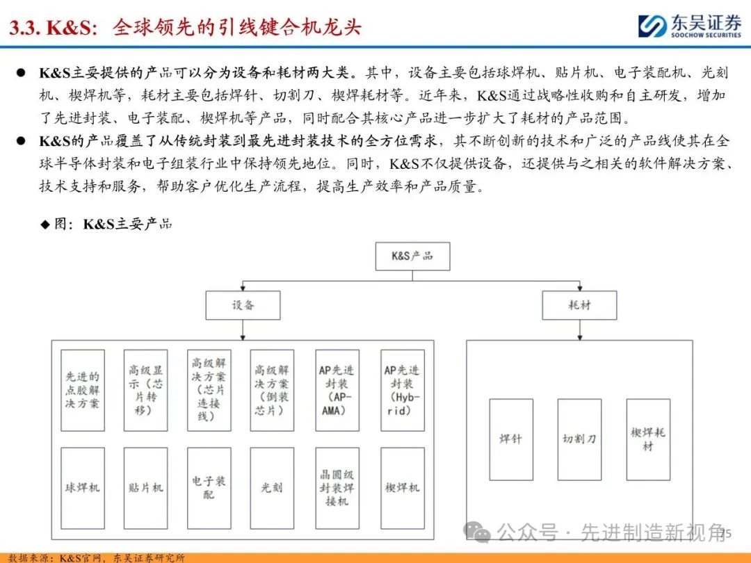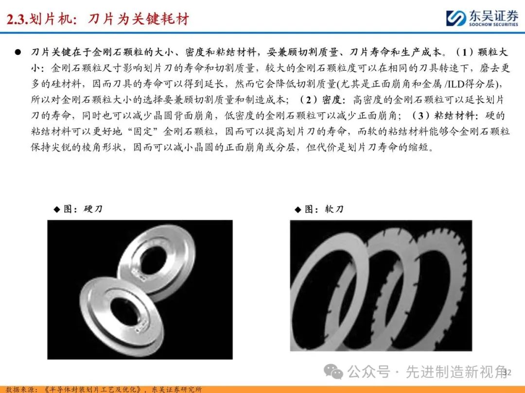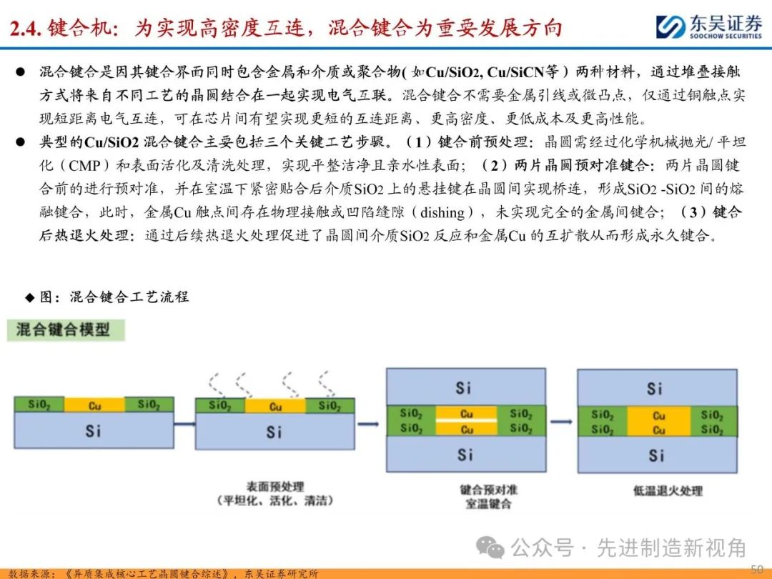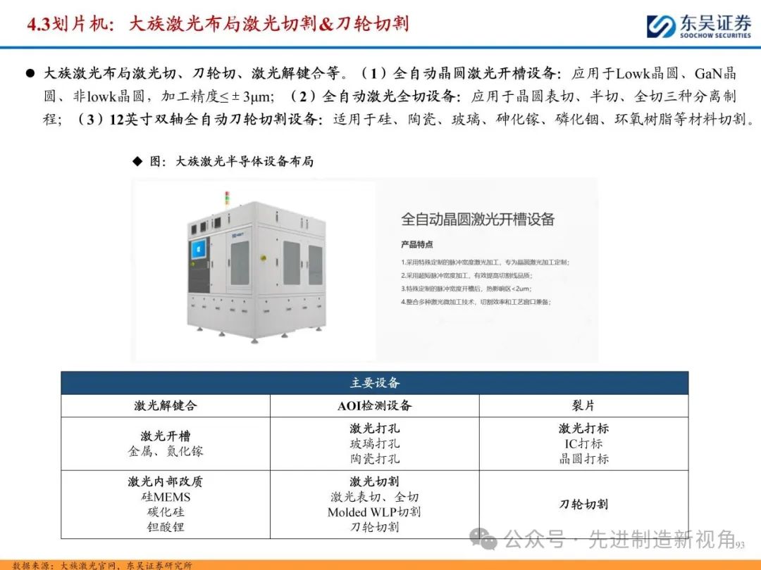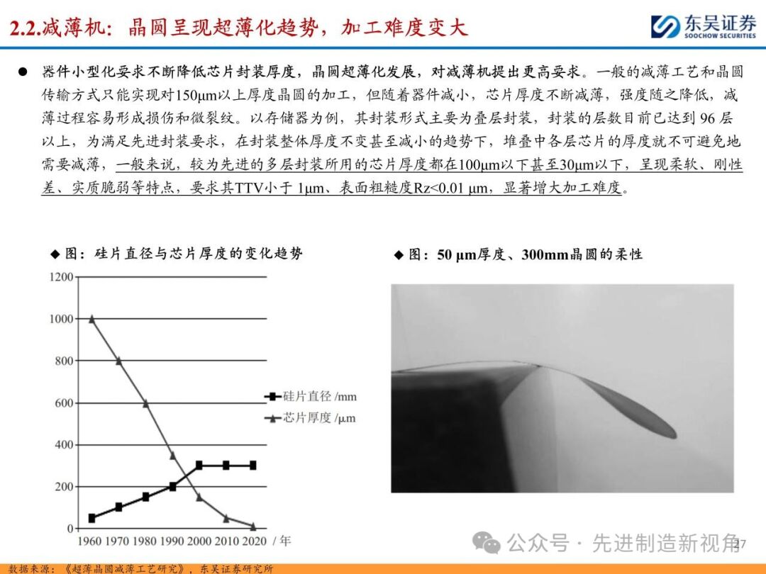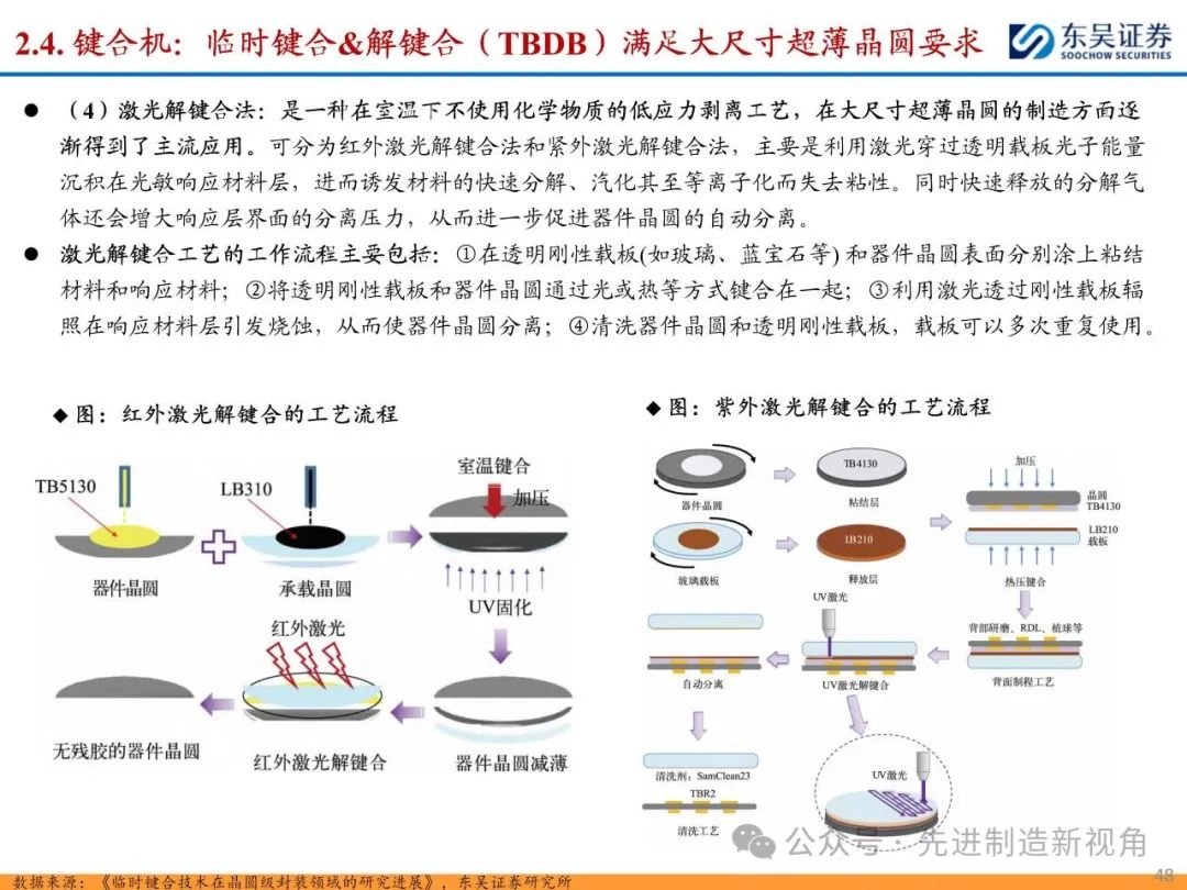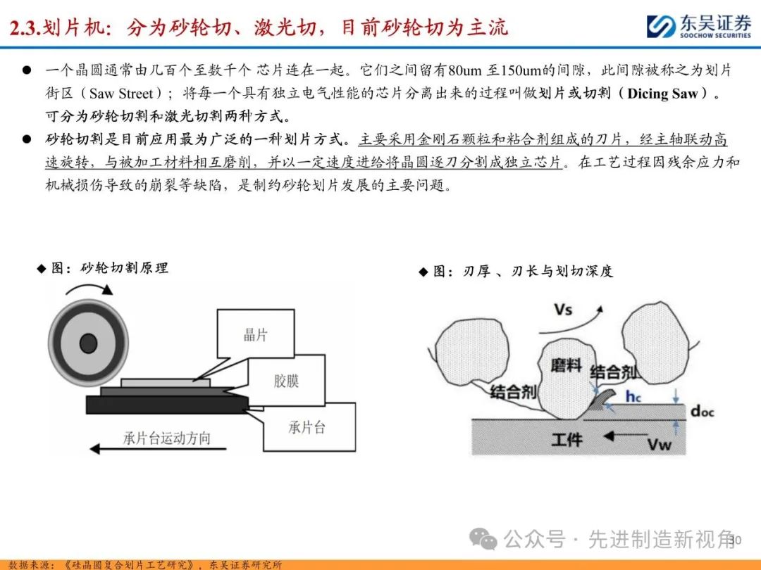 (1)传统后道设备:①减薄机:可分为转台式磨削和硅片旋转磨削两种方式,先进的多层封装芯片厚度都在100μm以下甚至30μm以下,增大减薄难度;②划片机:目前以砂轮划片机为主导,激光划片机补充,激光切在超薄硅晶圆、低k介质晶圆、小尺寸及 MEMS 芯片方面凸显出重要优势;③固晶机:对设备的效率和精度要求提高,关键在于视觉对位系统、运动控制等;④键合机:过去传统多为引线键合,但晶圆级封装技术快速发展,如临时键合&解键合是处理超薄晶圆背面制程工艺的关键支撑,混合键合仅通过铜触点实现短距离电气互连;⑤塑封机:转注封装多用于传统封装,先进封装背景下压塑封装为未来趋势;⑥电镀机:传统封装中电镀机主要在封装体的特定部位上沉积金属层,随着先进封装发展,例如凸块、 RDL、 TSV等均需要电镀金属铜进行沉积。