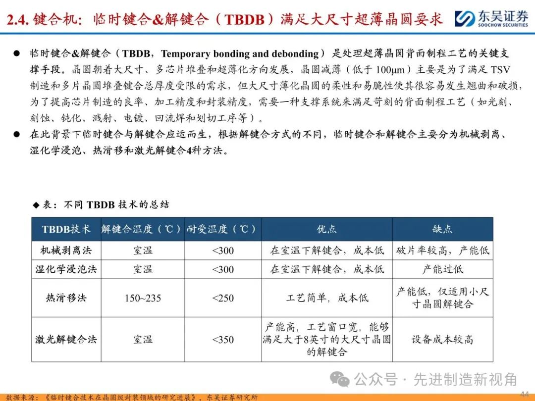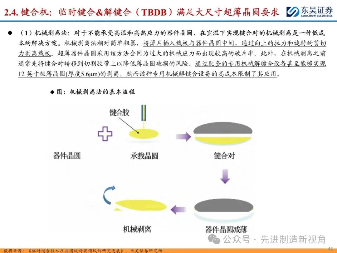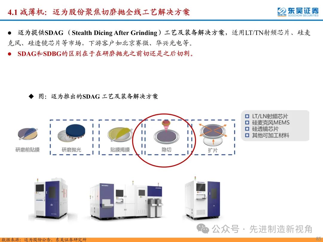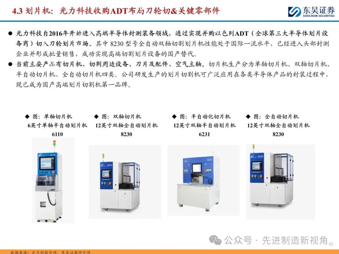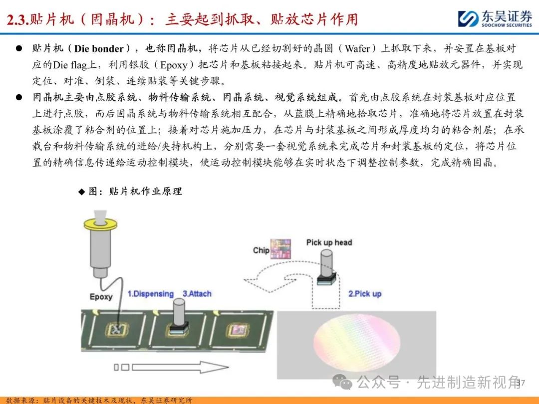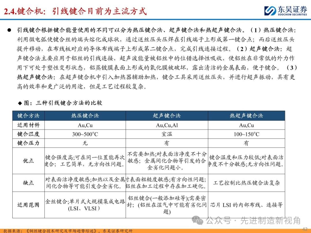 (1)传统后道设备:①减薄机:可分为转台式磨削和硅片旋转磨削两种方式,先进的多层封装芯片厚度都在100μm以下甚至30μm以下,增大减薄难度;②划片机:目前以砂轮划片机为主导,激光划片机补充,激光切在超薄硅晶圆、低k介质晶圆、小尺寸及 MEMS 芯片方面凸显出重要优势;③固晶机:对设备的效率和精度要求提高,关键在于视觉对位系统、运动控制等;④键合机:过去传统多为引线键合,但晶圆级封装技术快速发展,如临时键合&解键合是处理超薄晶圆背面制程工艺的关键支撑,混合键合仅通过铜触点实现短距离电气互连;⑤塑封机:转注封装多用于传统封装,先进封装背景下压塑封装为未来趋势;⑥电镀机:传统封装中电镀机主要在封装体的特定部位上沉积金属层,随着先进封装发展,例如凸块、 RDL、 TSV等均需要电镀金属铜进行沉积。