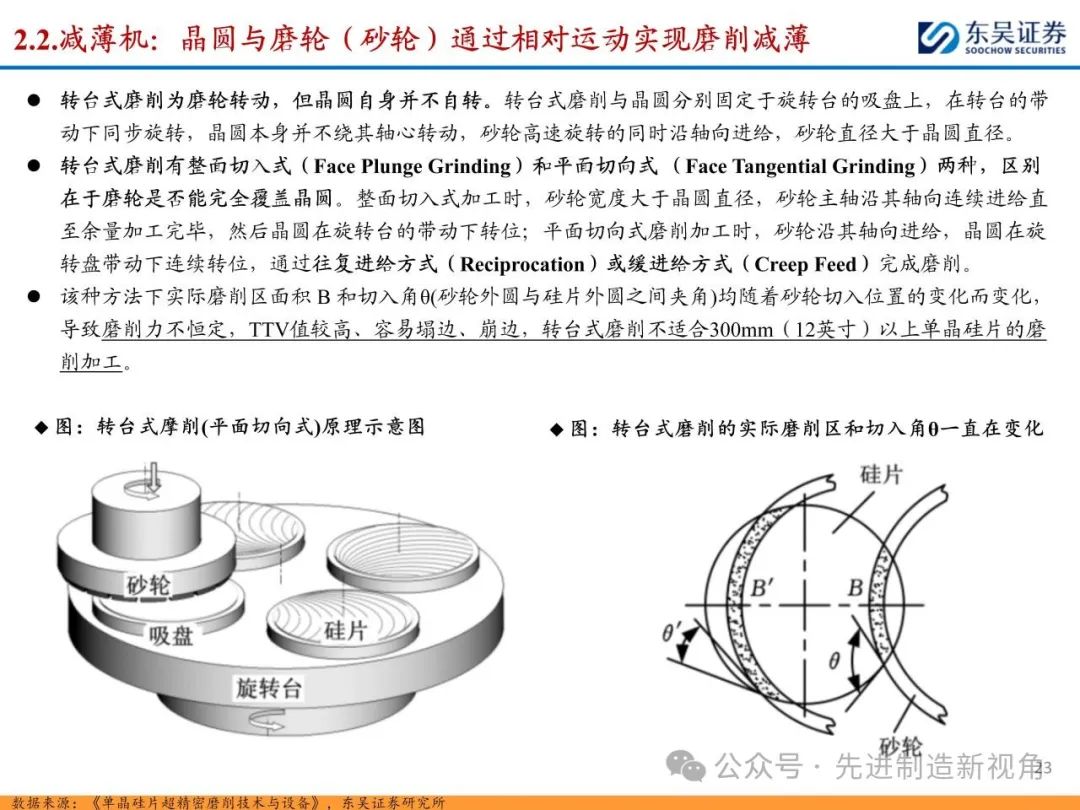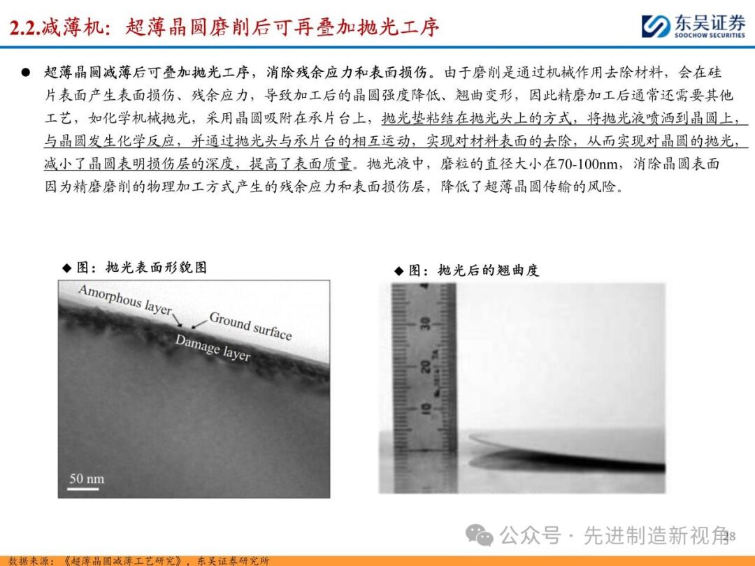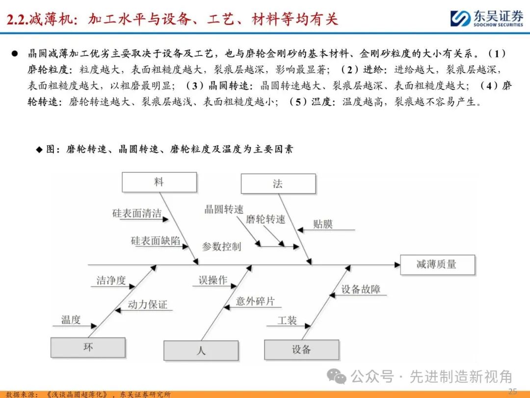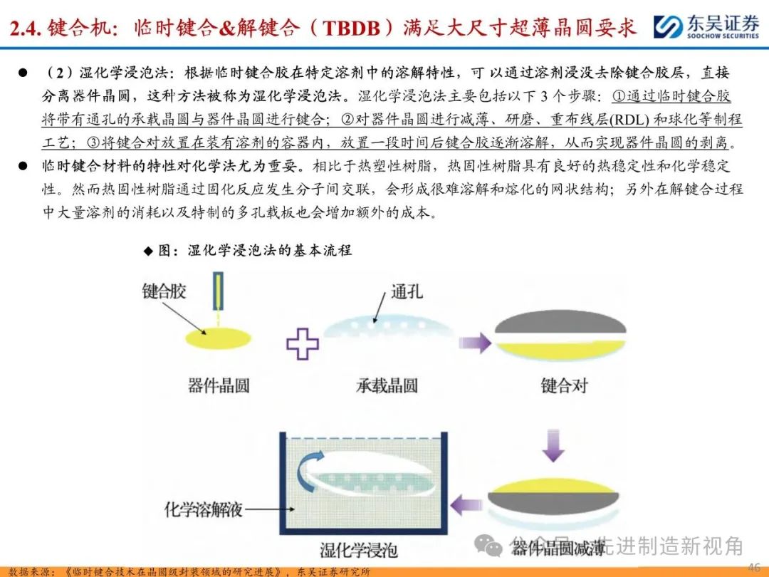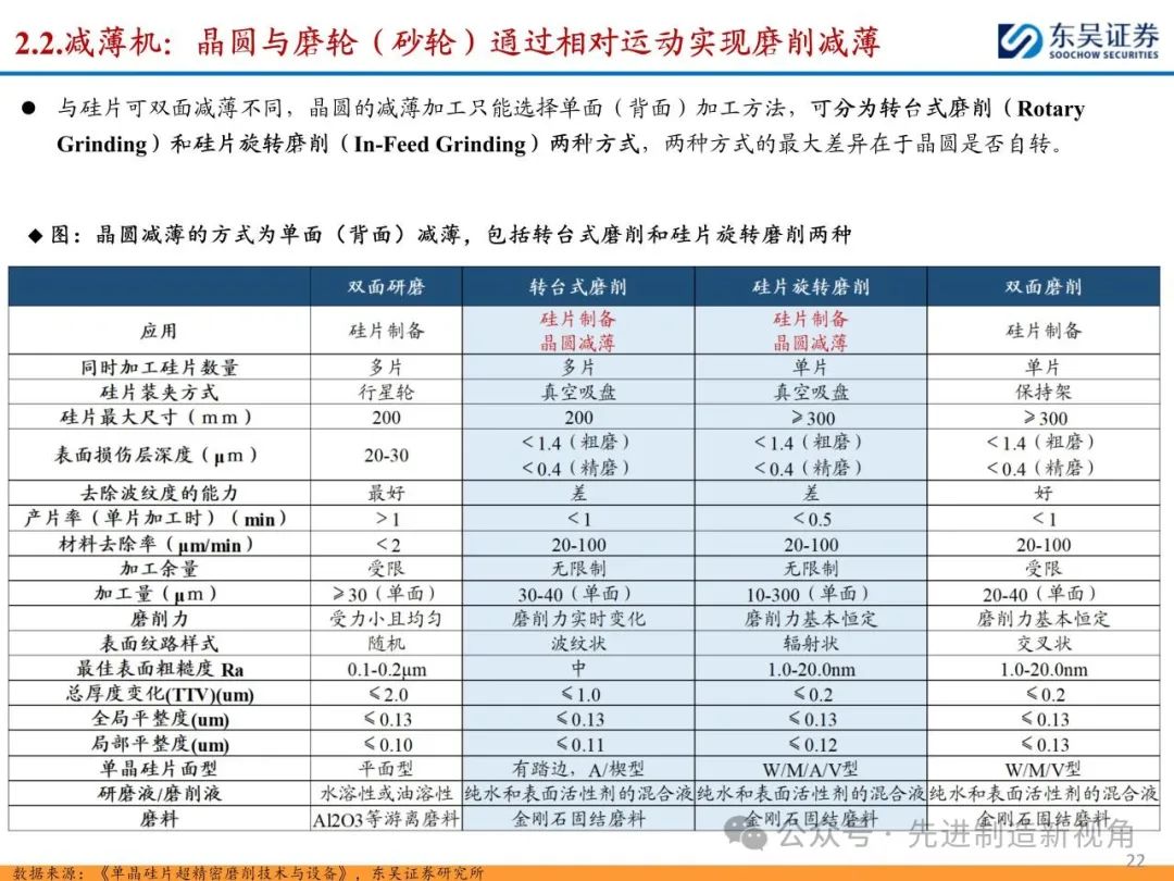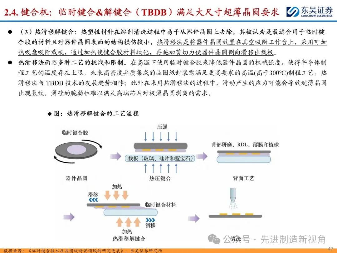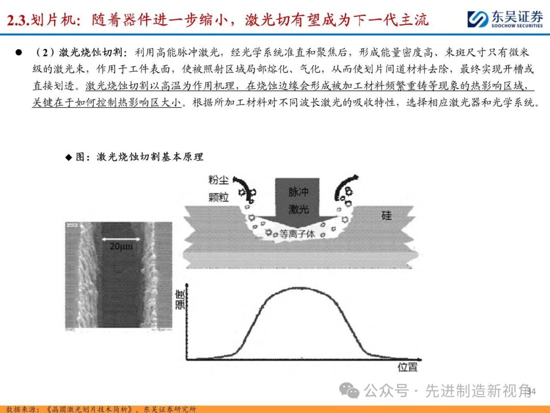 (1)传统后道设备:①减薄机:可分为转台式磨削和硅片旋转磨削两种方式,先进的多层封装芯片厚度都在100μm以下甚至30μm以下,增大减薄难度;②划片机:目前以砂轮划片机为主导,激光划片机补充,激光切在超薄硅晶圆、低k介质晶圆、小尺寸及 MEMS 芯片方面凸显出重要优势;③固晶机:对设备的效率和精度要求提高,关键在于视觉对位系统、运动控制等;④键合机:过去传统多为引线键合,但晶圆级封装技术快速发展,如临时键合&解键合是处理超薄晶圆背面制程工艺的关键支撑,混合键合仅通过铜触点实现短距离电气互连;⑤塑封机:转注封装多用于传统封装,先进封装背景下压塑封装为未来趋势;⑥电镀机:传统封装中电镀机主要在封装体的特定部位上沉积金属层,随着先进封装发展,例如凸块、 RDL、 TSV等均需要电镀金属铜进行沉积。
