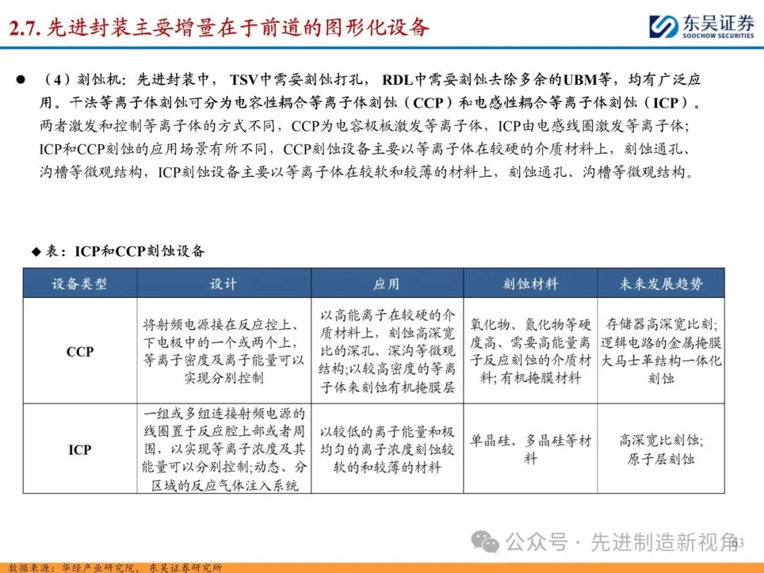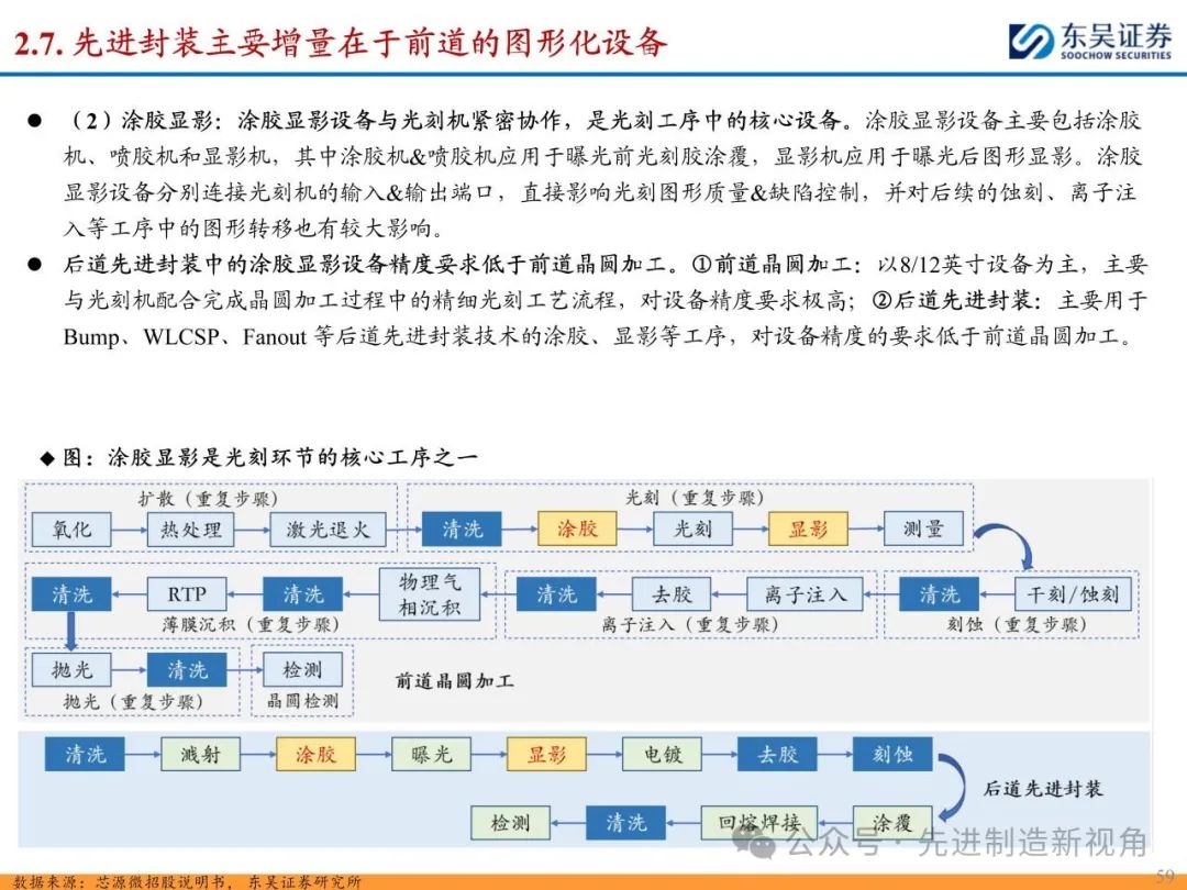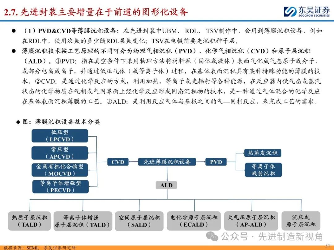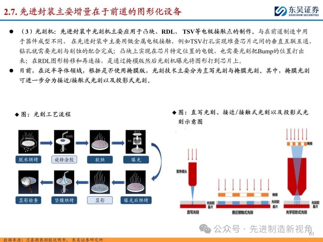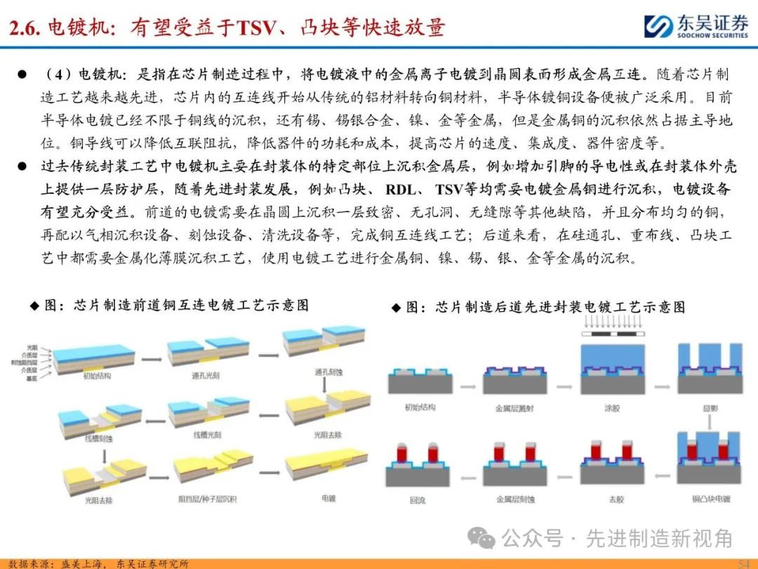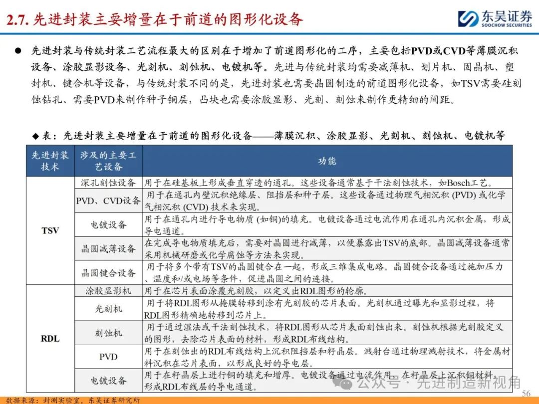 (2)新增前道图形化设备:先进封装与传统封装工艺流程最大的区别在于增加了前道图形化的工序,主要包括PVD或CVD等薄膜沉积设备、涂胶显影设备、光刻机、刻蚀机、电镀机等,如TSV需要硅刻蚀钻孔、需要PVD来制作种子铜层,凸块也需要涂胶显影、光刻、刻蚀来制作更精细的间距。