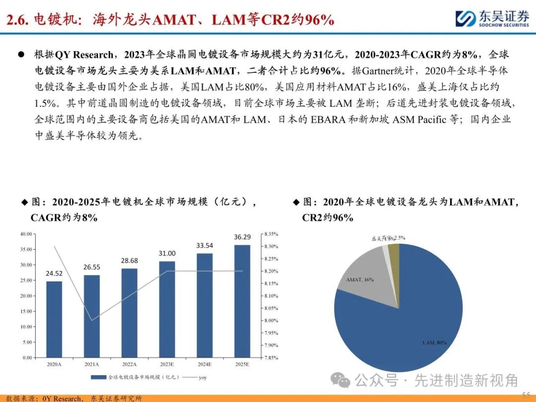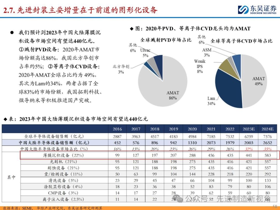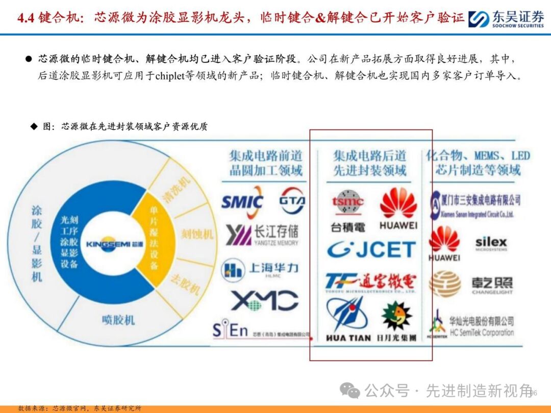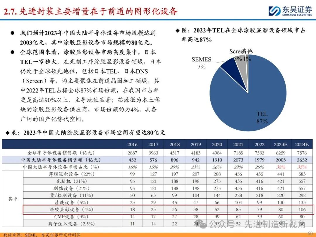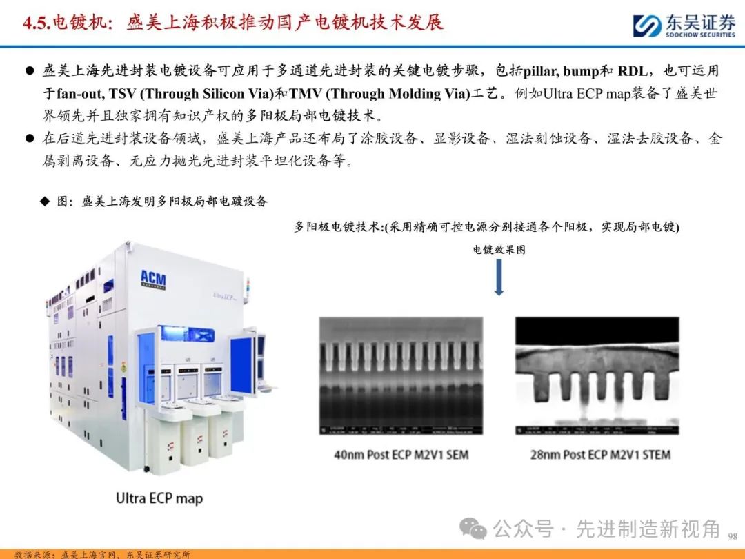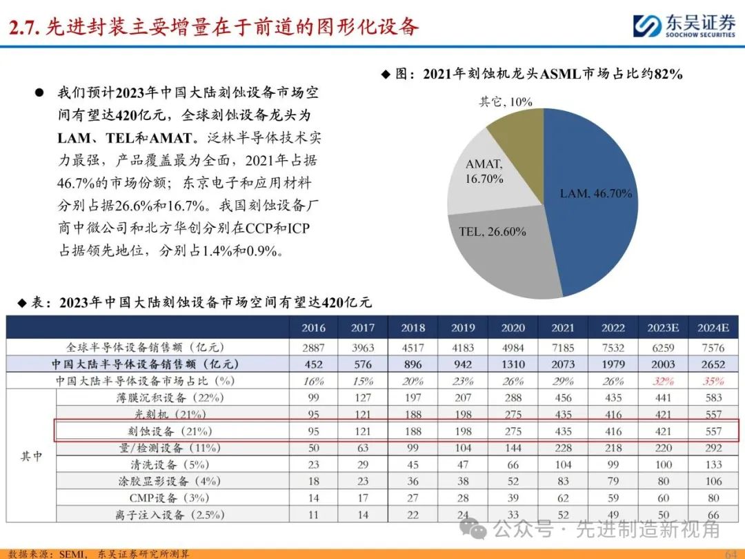 (2)新增前道图形化设备:先进封装与传统封装工艺流程最大的区别在于增加了前道图形化的工序,主要包括PVD或CVD等薄膜沉积设备、涂胶显影设备、光刻机、刻蚀机、电镀机等,如TSV需要硅刻蚀钻孔、需要PVD来制作种子铜层,凸块也需要涂胶显影、光刻、刻蚀来制作更精细的间距。