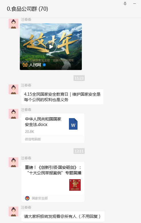 4月15日是第九个全民国家安全教育日,活动主题为“总体国家安全观·创新引领10周年”。国家安全是安邦定国的重要基石,维护国家安全与每个人的切身利益密切相关。4月15日,食品公司积极开展全民国家安全教育日普法系列活动,通过教育培训、海报张贴、信息推送等方式,引导职工树立国家安全意识,自觉关心、维护国家安全。