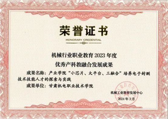 近期,机械行业职业教育2023年度产科教融合发展成果和产学研合作项目评选结果公布,我校电气工程学院《产业学院“小芯片、大平台、三融合”培养电子封测技术技能人才的探索与实践》案例获评“机械行业职业教育2023年度优秀产科教融合发展成果”。
