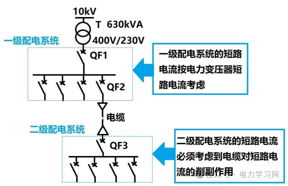 得到这些数据有何用?用于确定低压成套开关设备的进线回路断路器以及馈电回路断路器短路参数。我们看下图:
