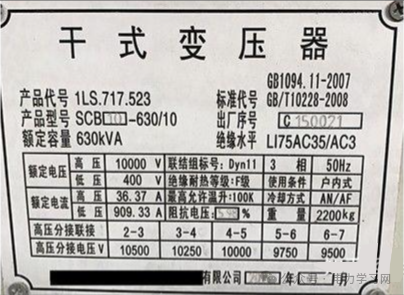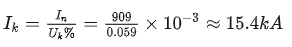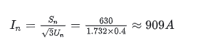 注意到图1所示电力变压器铭牌中有3个关键数据,其一是电力变压器容量Sn=630kVA,其二是电力变压器低压侧的额定电压(线电压Un=400V,其三是电力变压器的阻抗电压Uk%=5.9%,近乎为6%。我们据此来计算此变压器低压侧短路电流。