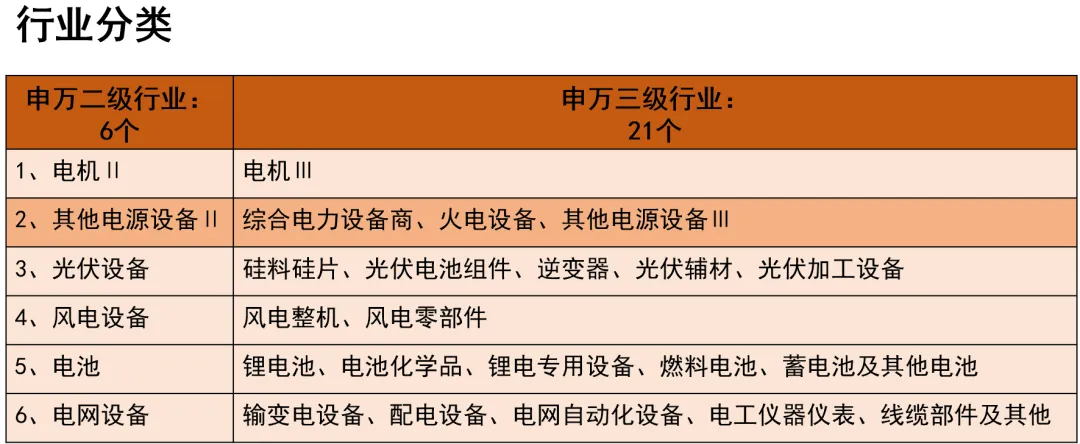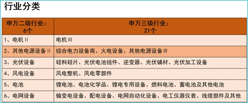 我们知道了中国和全球的用电需求总体稳中有增的态势之后,下面看看电力设备行业的6个具备二级行业的具体情况。