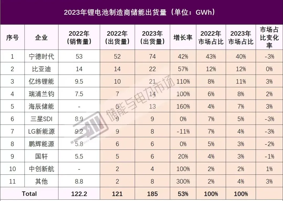 在中国储能电池市场份额中,你会非常清楚看到宁德时代、比亚迪、亿纬锂能这三家的市占率TOP3。