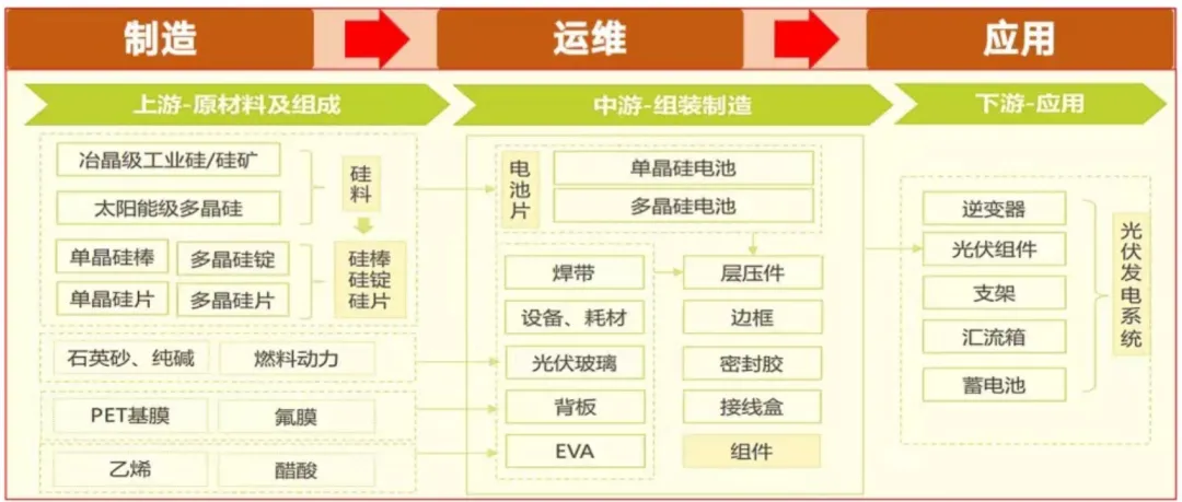以光伏为例,看一下光伏产业的结构,从上游的原料到中游的组装,再到下游的应用就全有了。
